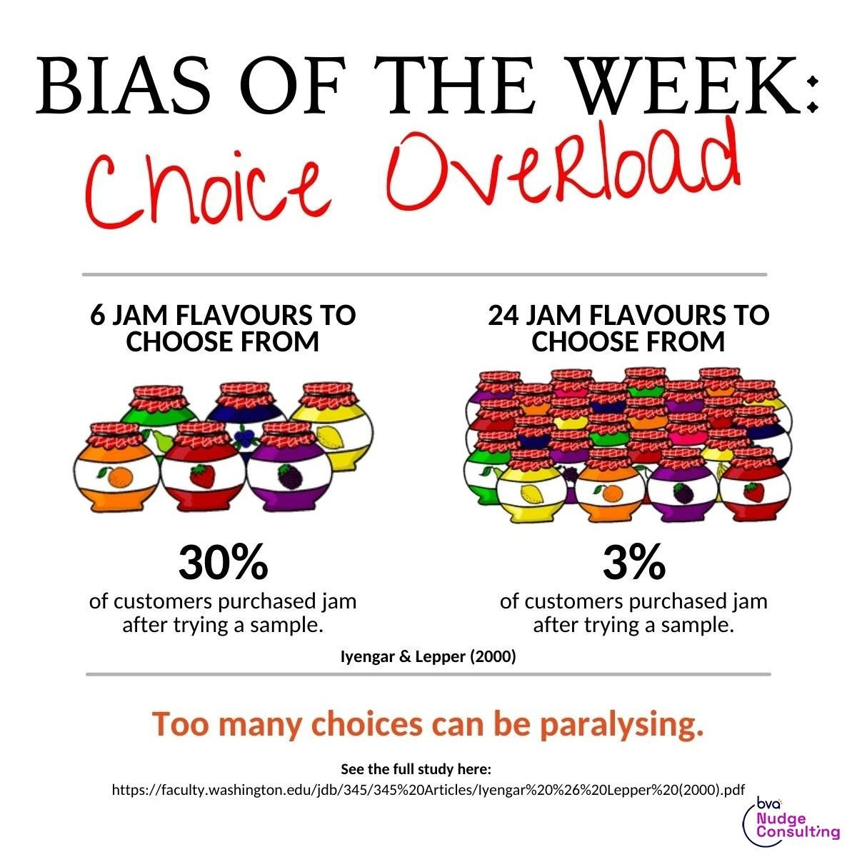 사진설명 (콜롬비아와 스탠포드 대학의 심리학자 Iyengar와 Mark LepperIyengar의 잼 실험(2000) : 6가지 고급 잼 중에서 선택할 수 있는 기회가 주어진 개인은 24-30가지 중에서 선택한 참가자보다 잼을 구매할 가능성이 더 높았으며, 선택에 대한 만족도도 더 높았습니다.)
