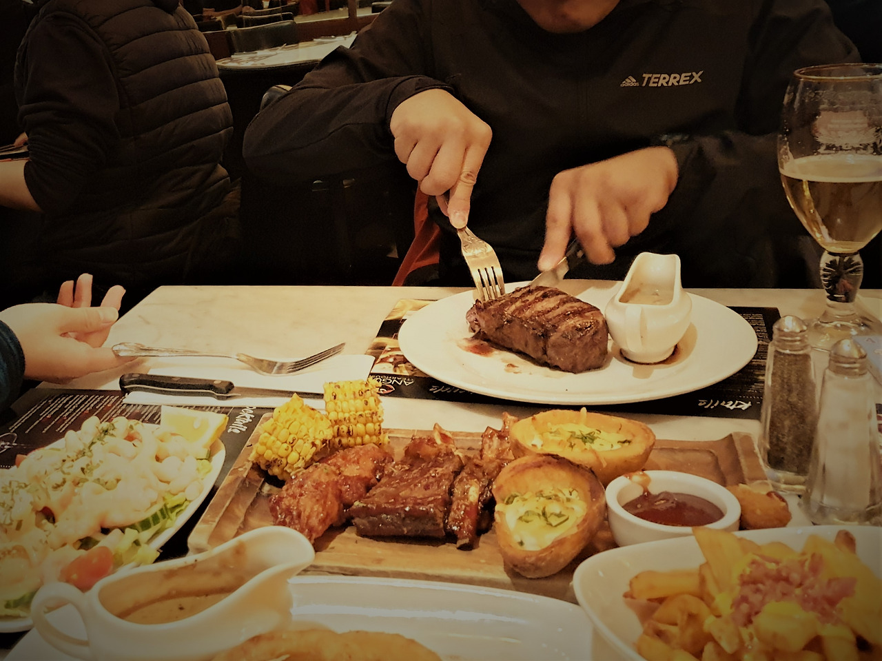 양이 많지 않지 않았지만, 맛있었다. 여러 종류의 스테이크를 시켜서, 조금씩 나누어 먹었다. 외국인들은 이런 한국식 식사법을 잘 이해 못하는 분위기이지만 우리는 상관하지 않았다. 로마에 가면 로마의 법을 따르겠지만 여기는 런던인 데다가, 우리는 반찬을 나누어 먹는 한국인이다. 가능하다면 여분의 그릇을 달라고 해서 덜어 먹었다. 립아이가 제일 괜찮았고, 필렛은 어느 부위인지는 모르겠지만 별로 였다.