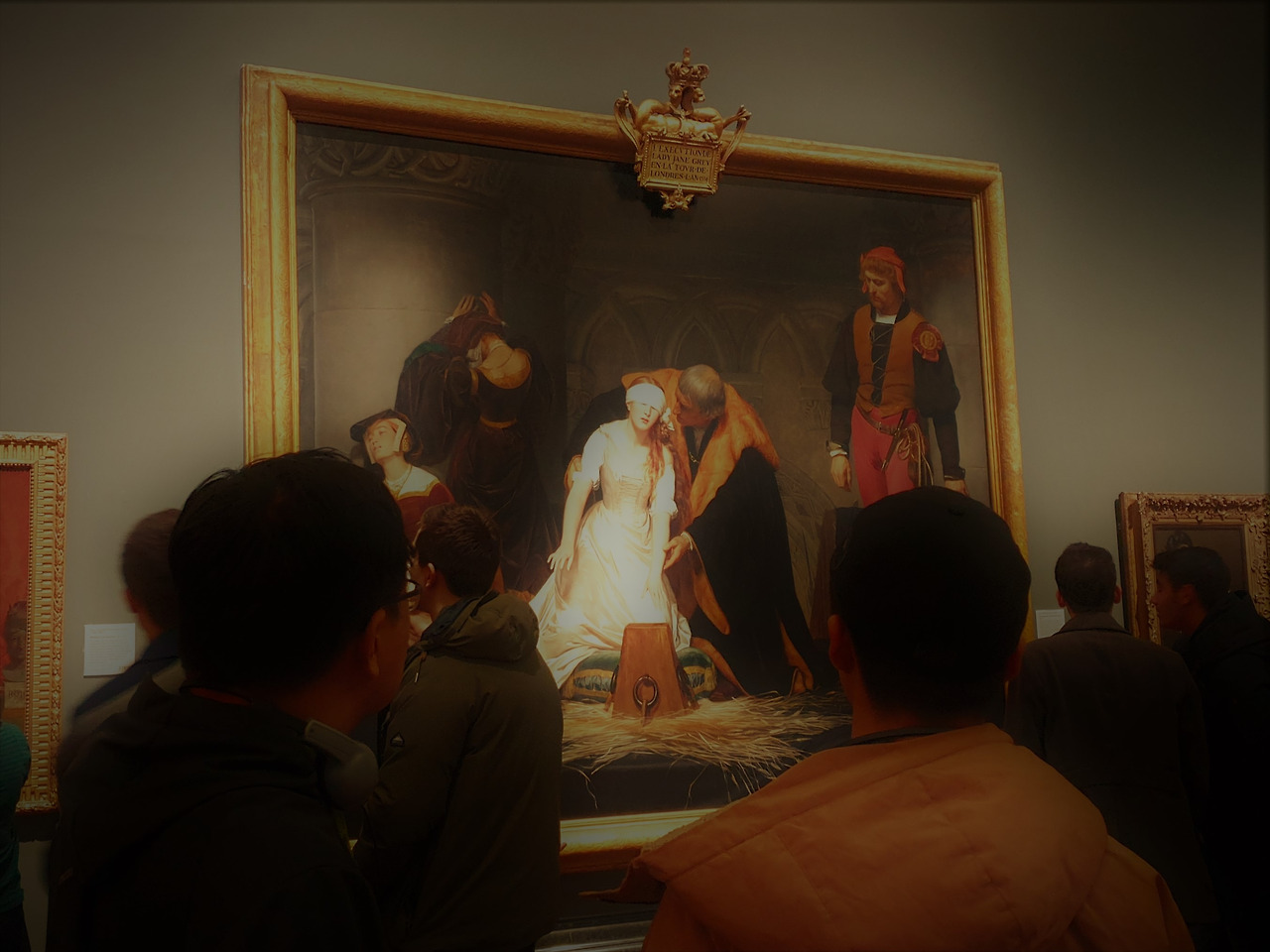 그중 빼놓을 수 없는 그림은 제인 그레이의 처형이었다. 역사에 관심이 많은 편이라 제인 그레이라는 이름을 보자 눈이 동그라졌다. 하. 이 어린 소녀의 죽음을 이렇게 묘사해 놓았구나 싶어 애틋함이 느껴졌다. 아름답고 총명했지만 왕이 되고 싶지 않았던 이 소녀, 왕이 되기 싫다고 울고 불고 매달린다. 그렇지만 권력욕에 눈이 먼 제인 그레이의 아버지는 그녀를 탑에 가두고 때리기 시작했다. 그녀의 입에서 왕이 되고 싶다는 말이 나올 때까지 때린다. 그렇게 그녀는 영국의 여왕이 되었지만 정통성이 떨어지다 보니, 사람들의 호응이 크지 않았다. 결국 내전이 일어나고 그녀는 패배한다. 그녀의 5촌 고모 메리가 다음 여왕이 된다.