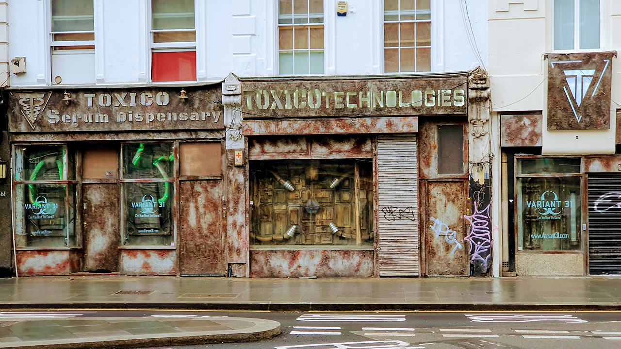 거리에서 본 특이하게 생긴 간판. 정체를 모르겠다. 약국은 아닌 것 같고, 펍인가..