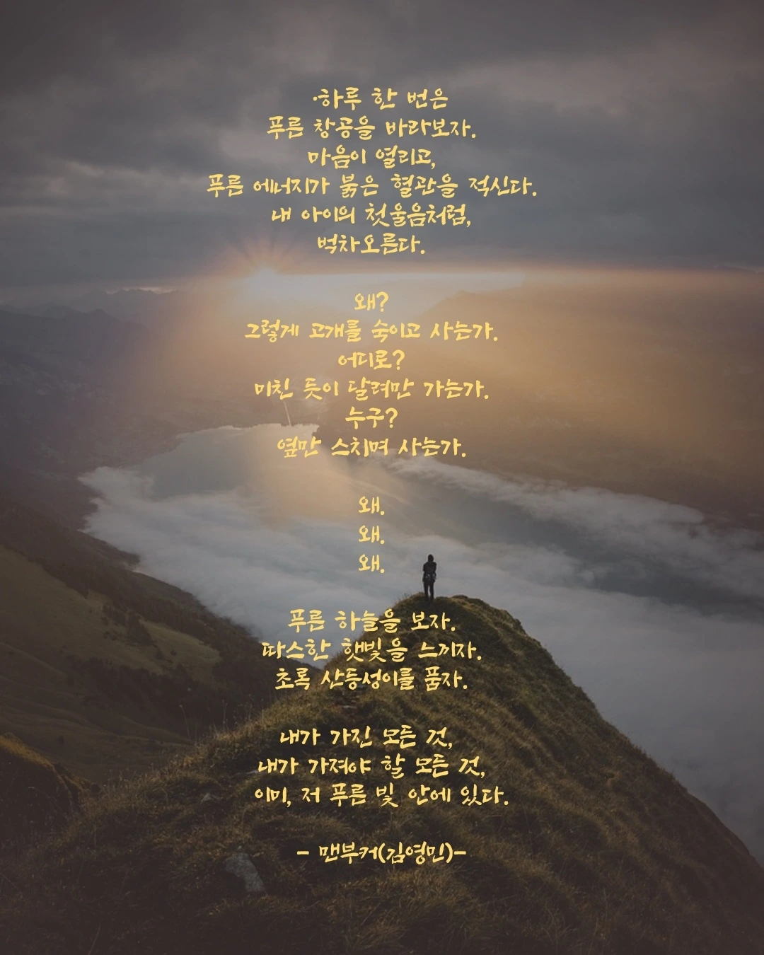 사회적으로는 박봉이지만 내 이웃 모두가 안전하고 서로의 지식과 지혜를 아낌없이 나누며 함께 성장하는 공동체를 꿈꾸는 대한민국 공무원입니다. 독서,글쓰기,운동을 루틴으로 합니다.