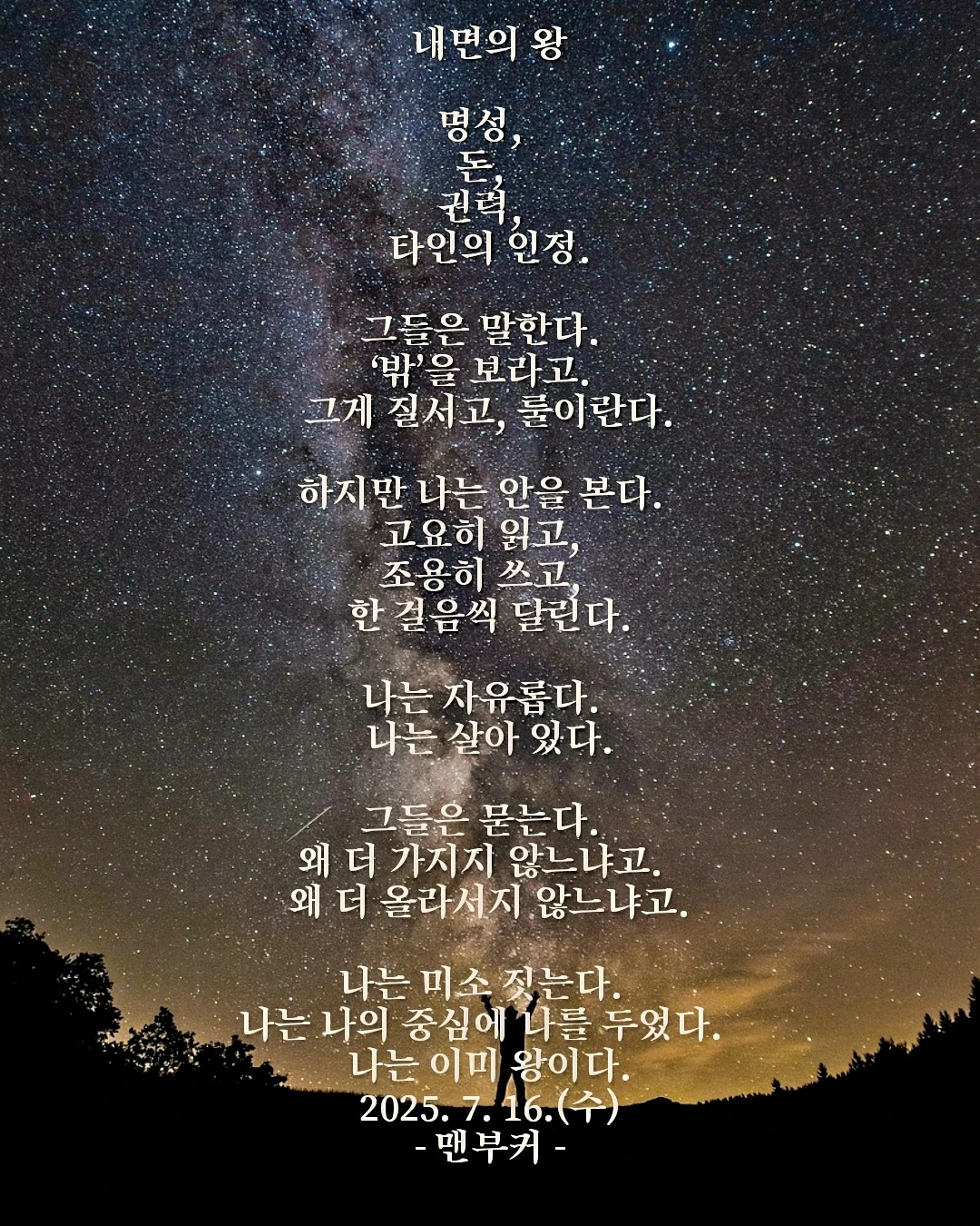 사회적으로는 박봉이지만 내 이웃 모두가 안전하고 서로의 지식과 지혜를 아낌없이 나누며 함께 성장하는 공동체를 꿈꾸는 대한민국 공무원입니다. 독서,글쓰기,운동을 루틴으로 합니다.
