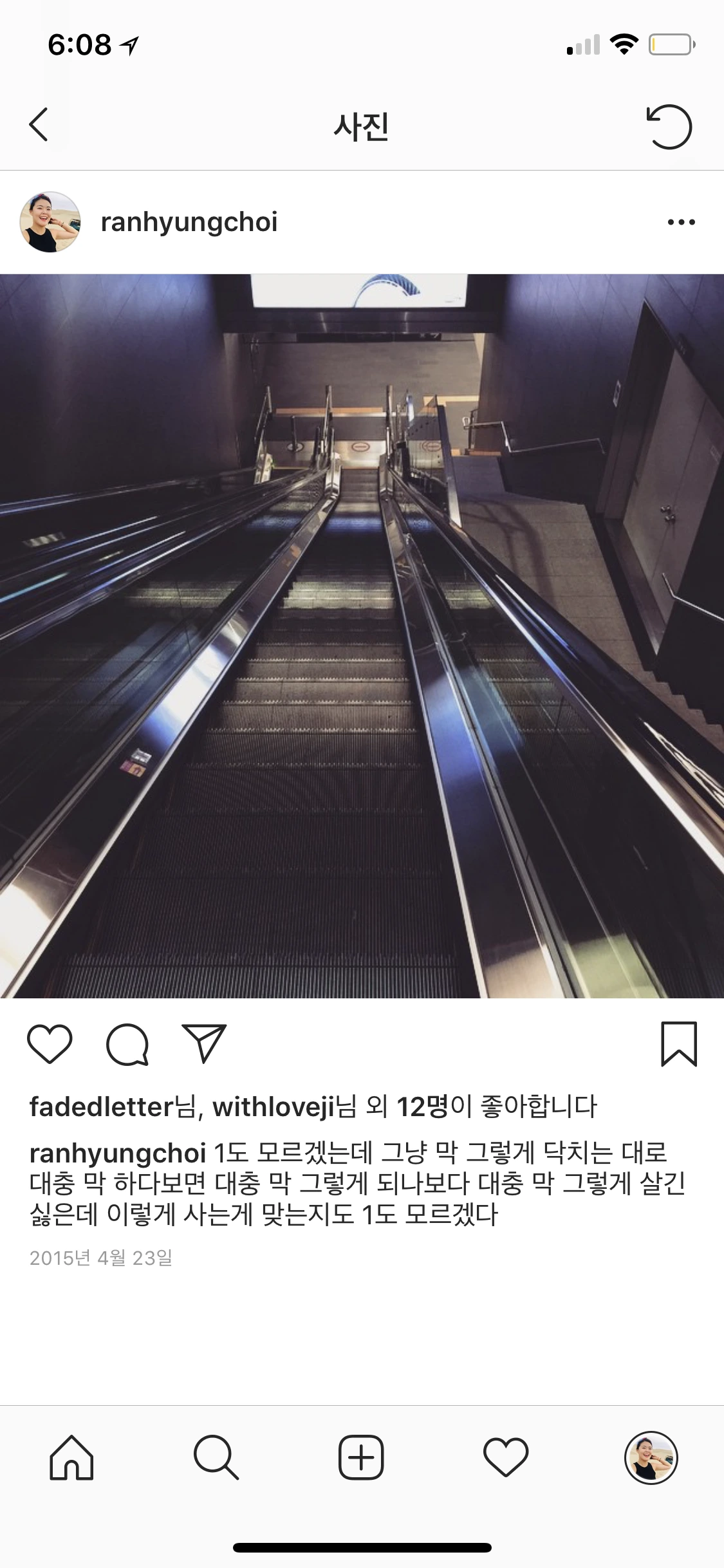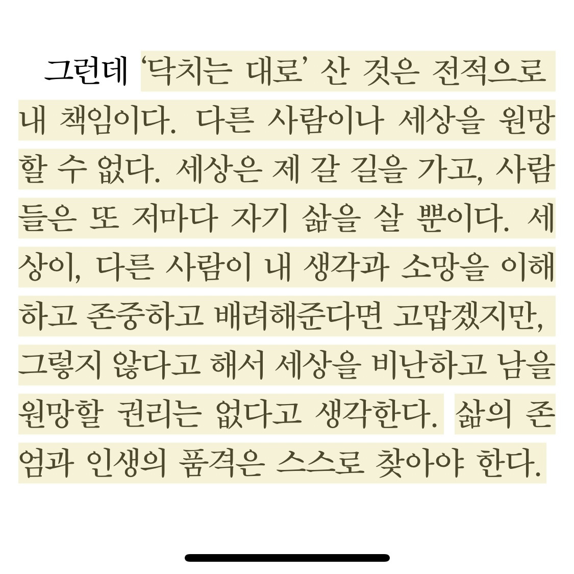 본인의 삶을 이야기하면서 '닥치는 대로 살아왔다'고 말했고, 그것은 전적으로 본인의 책임이라고 말했다. 삶의 존엄과 인생의 품격은 스스로 찾아야 한다고 했다. '뭐지?' 하며 몇 번을 반복해서 저 문장을 읽었는지 모르겠다. 나는 나의 삶을 닥치는 대로 살아왔다고 생각했지만 내가 닥치는대로 살아올 수 밖에 없었던 이유는 전적으로 남탓이야, 구조탓이야 라고 주장하던 사람이었다. 불과 며칠 전에도 비슷한 생각을 했던 기억이 나면서 순간 소름이 돋았다. 몇 해 전, 공항철도 에스컬레이터 위의 내가 여기 다시 있었다.