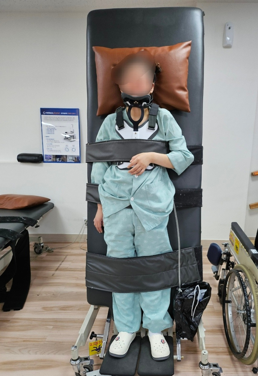 2주 정도가 지난 후에야 나는 기립기를 재시도할 수 있었다. 여러 운동과 로봇치료로 기립에 익숙해진 이후였다.