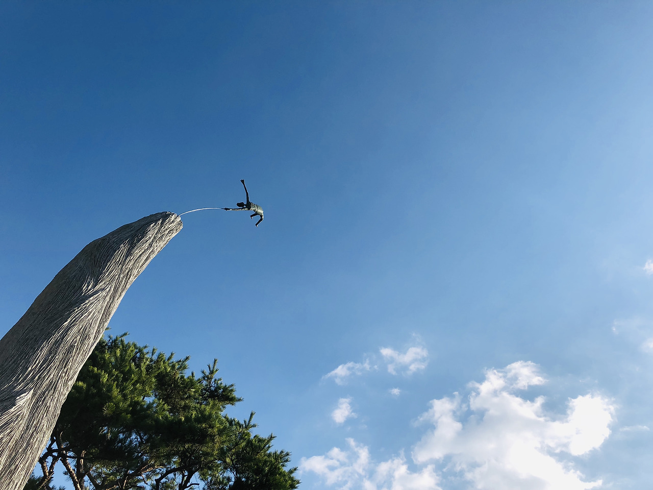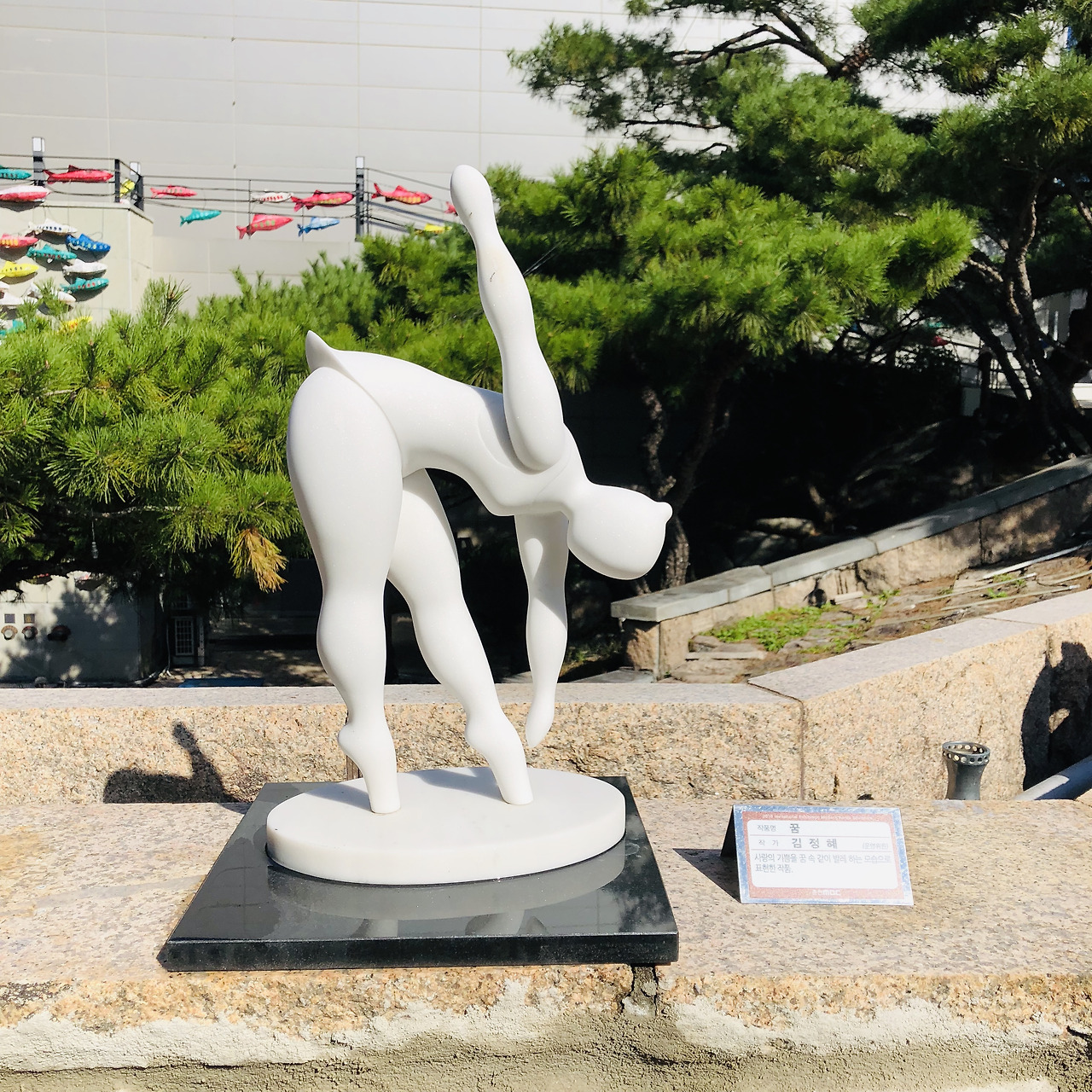 조각에 대해서 잘 모르는 나지만, 매일 보다 보니 작품들에 정이 들기 시작한다. 자세히 보면 작가가 무엇을 표현하고 싶었는지도 조금은 알 수 있을 것 같다. 그중에서 가장 눈에 들어오는 작품은 사람이 하늘로 날아가는 모양을 형상화한 'Fly in the sky'라는 작품이다. 바람결에 흔들리는 나무 위에 한 사람이 하늘로 솟아오른다. 아마도 전시된 작품 중에 키가 제일 큰 것 같다. 파란 가을 하늘을 향해 역동적으로 솟아오르는 사람의 형상을 보고 있노라면, 나 또한 날아오르는 기분이 든다. 속이 다 시원해진다.