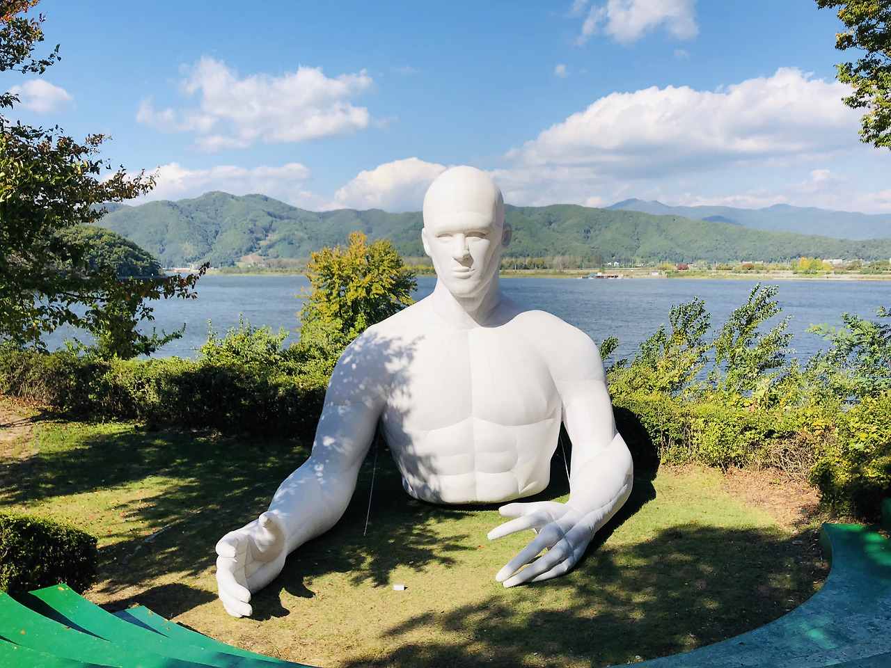 호수가 쭉 펼쳐지는 뒷마당에는 조금 더 다양한 크기의 작품들을 볼 수 있다. 호숫가에 다다르면 멋진 호반을 배경으로 슬픈 눈빛의 한 거인이 보인다. 살며시 벌린 팔은 누군가를 껴안아주기 위함일까. 작가는 아파하는 사람들을 포용하는 형상을 표현해 조금이나마 위안이 되길 바라는 마음을 담았다고 한다. 돌이나 청동, 철 등을 재료로 만든 기존 조각 작품들과는 달리 이 작품은 거대한 크기의 풍선 오브젝트에 공기를 주입한 것으로 어떤 작품보다 생동감이 느껴진다. 이밖에도 곳곳에 숨어있는 작품들을 통해 인간과 자연에 대한 작가의 치열한 탐구와 통찰을 느낄 수 있다.