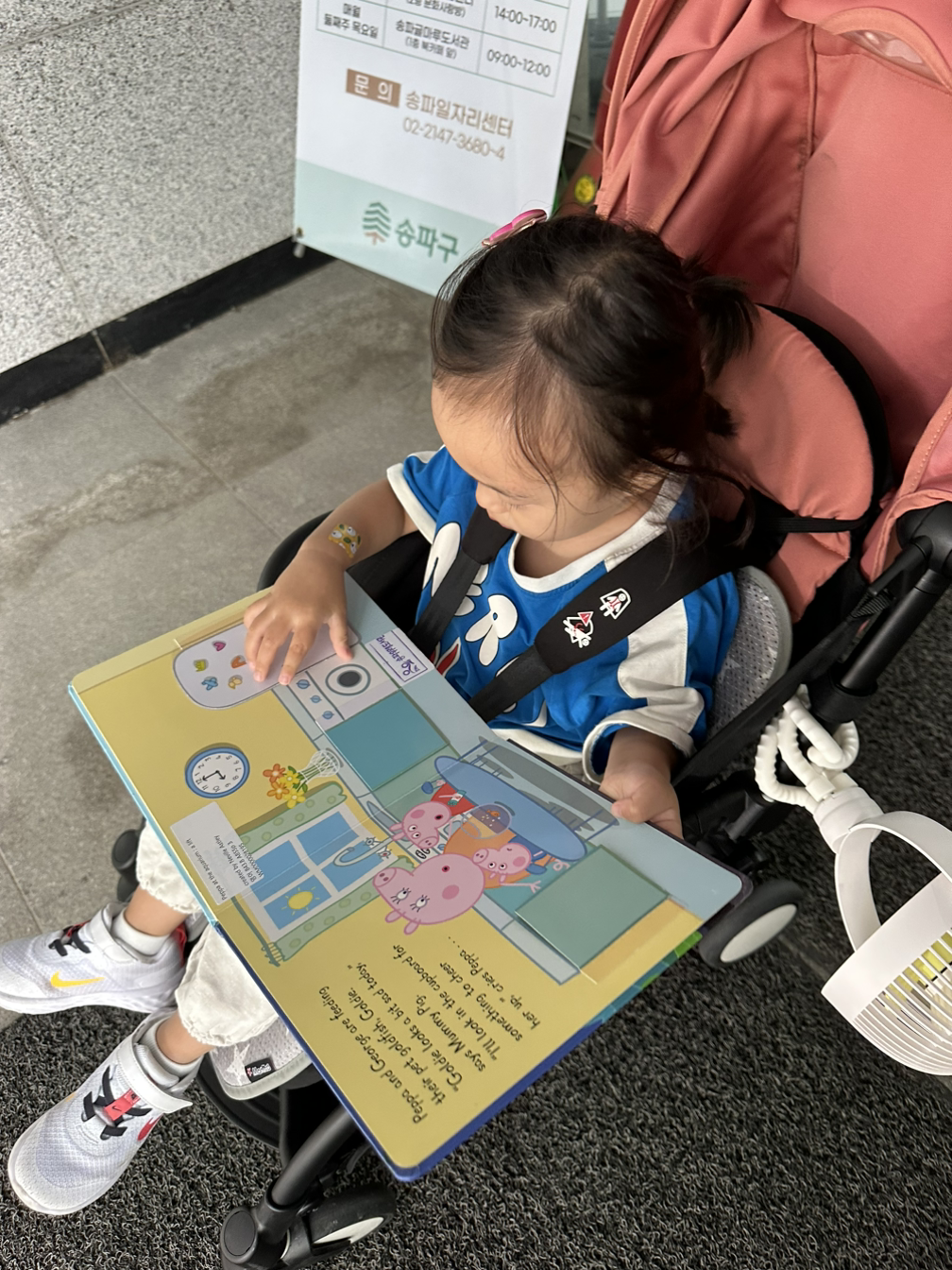 그렇게 아이가 100일 때부터 2개 언어를 들려주며 욕심을 부리던 나는, 아이가 두 돌이 되면서 이제는 제대로 영상노출을 해도 되겠다는 생각이 들어 ‘까투리’, ‘호비’, ‘페파피그’, ‘핑구’ 등을 보여줬고, 그중 영어와 한국어가 모두 있는 페파피그가 그림체도, 내용도 마음에 들었다. 그러던 와중 지인으로부터 페파피그 원서 시리즈를 선물 받았다. 나는 아버지 덕분에 감사하게도 어린 시절 해외에서 미국 국제학교를 다녀서 영어 원서를 읽고 번역해서 읽어주는 데에도 어려움이 없어서, 아이에게 편하게 원서를 읽어줬다. 영어로도 읽어줬지만 잘 이해를 못 하는 것 같아서 한국어로 더 많이 읽어줬고, 그렇게 아이는 페파피그를 책으로 먼저 친해졌다.