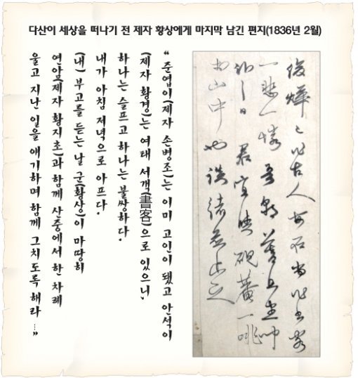 다산의 마지막 편지는 다산이 1836년 2월 22일 타계 직전, 제자들이 힘들 것을 염려해 부고를 들어도 오지 말고 산중에서 한 차례 곡하는 것으로 문상을 대신하라고 당부한 스승의 애절한 심정이 드러나 있다. 제자 황상은 이 편지를 지니고 강진으로 가던 중 스승의 부고를 듣고 발길을 되돌렸다.