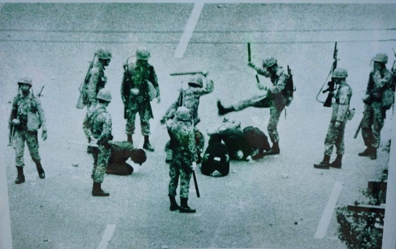 그때, 갑자기 트럭을 타고 온 군인들이 거리에서 시위하는 젊은 사람들을 진압봉으로 패기 시작했다. 조금 전까지도 저항하며 시위하던 젊은이들이 진압봉을 맞고 바닥에 꼬꾸라졌다. 군인들은 잡힌 젊은이들의 손을 등 뒤로 묶고 바닥에 무릎을 꿇렸다. 온몸을 공포로 벌벌 떠는 젊은이도 있었다. 군인들은 그들을 억지로 트럭에 태우고 어디론가 가버렸다.