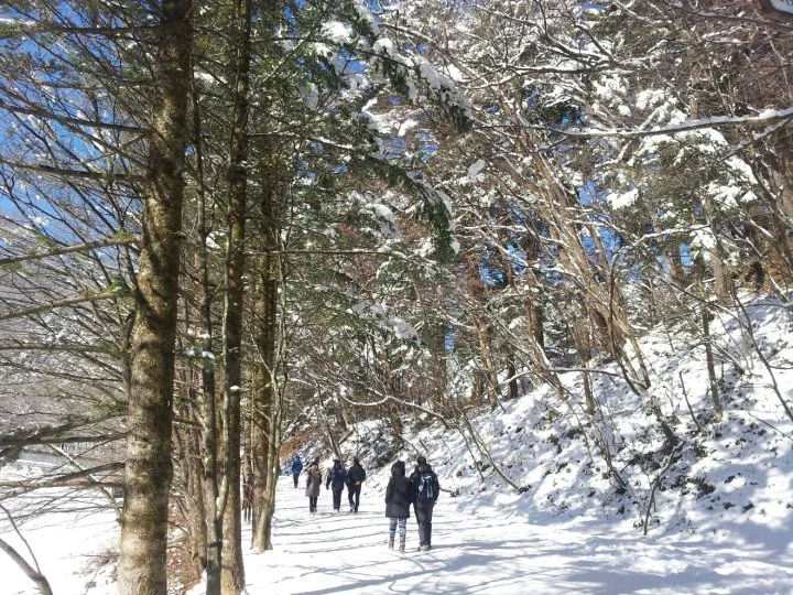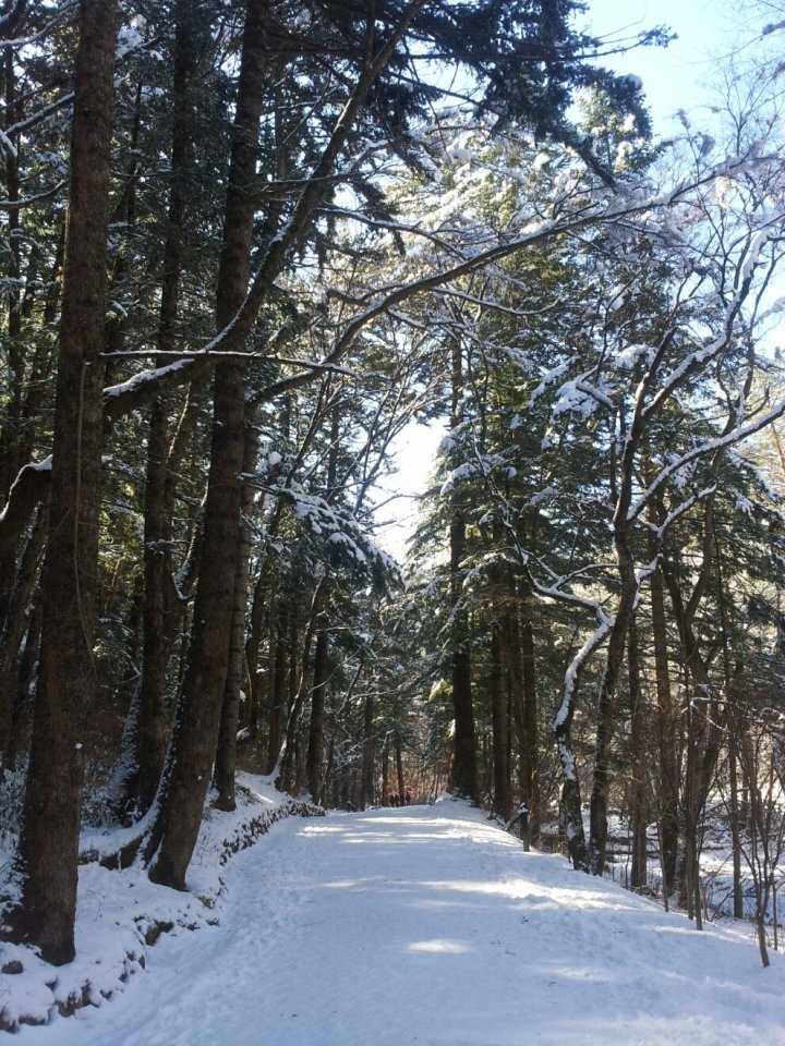 아침 안개가 걷힌 전나무 숲길은 하얀 눈에 쌓여 더욱 선명한 모습을 띠고 있습니다. 눈 쌓인 길을 맨발로 걸을 순 없지만, 눈길을 뽀드득 거리며 밟는 느낌이 신선하고 상큼합니다.