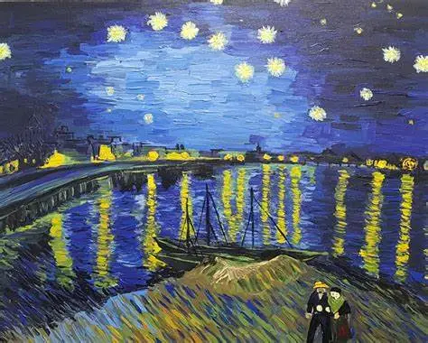 밤하늘을 표현하는데 검은색을 사용하지 않고 파란색과 보라색 초록색만을 사용하며 그림을 그리는 동안 고흐는 행복한 기분을 느꼈음을 알 수 있다.