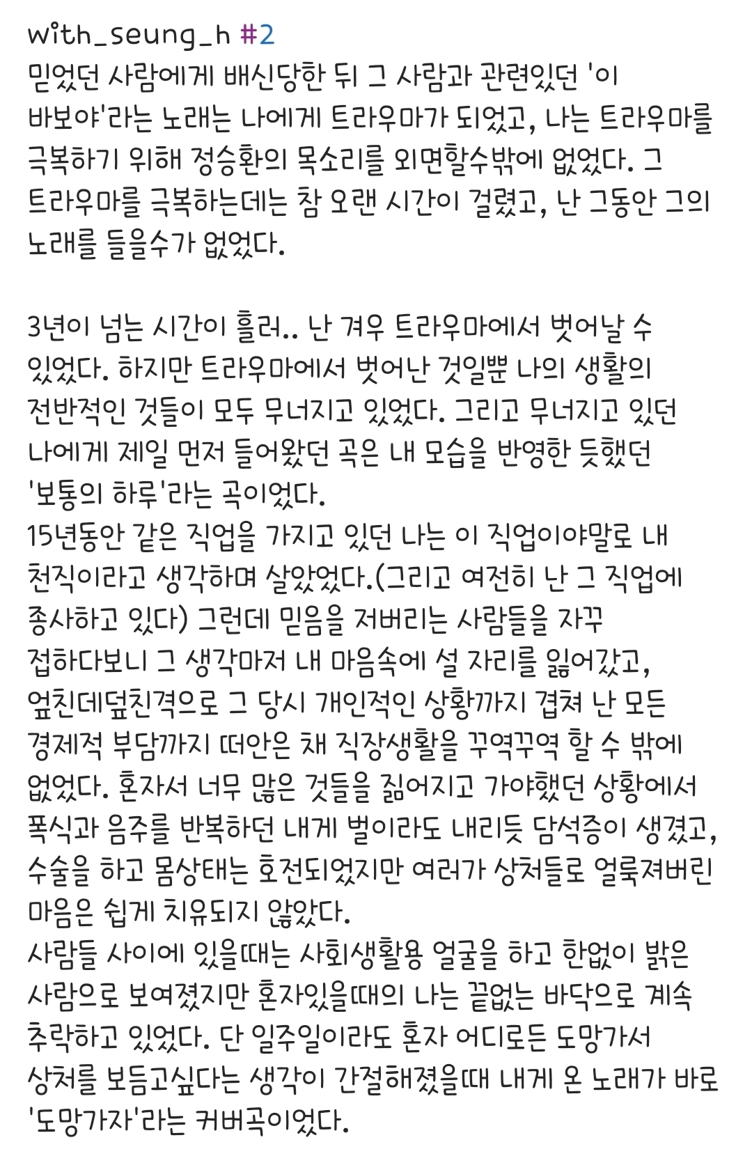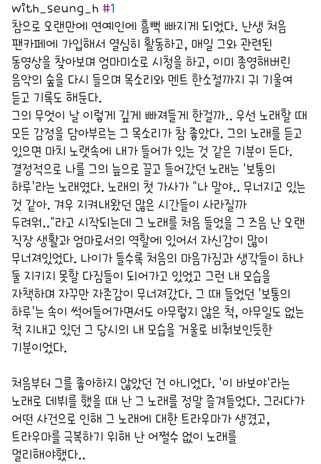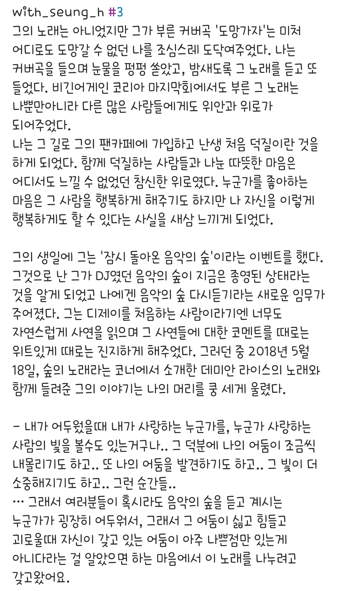 기운 없이 누워있던 상태로 할 수 있던 건 음악을 듣는 일뿐이었는데 그때 도망가자라는 커버곡을 부르던 정승환의 목소리에 위로를 받고 예전에 진행했던 라디오를 다시 듣기 시작했다. 사람에 대한 미움이 마음속에 가득하던 나에게 아직까지도 가장 영향력 있게 다가왔던 말이 바로 '나를 괴롭히는 사람을 긍휼히 여기라'는 말이었다. 긍휼히 여긴다는 말은 기독교에서 쓰는 말인데, 간단히 말해 '불쌍히 여긴다'는 말. 남을 괴롭히느라 인생을 낭비하며 사는 사람을 보며 '남을 미워하며 사는 인생 참 불쌍하다' 하고 생각하면 마음이 정말 편해졌고, 미워하는 마음들을 스스로 다스릴 수 있게 됐다. (그렇게 어쩌다 보니 지금은 팬카페 매니저를 3년째 하고 있다.) 이런 과정들을 글로 남겨두고자 '덕질일기'를 쓰기 시작했다. 파도치던 감정들을 글로 적으며 내 마음을 좀 더 깊게 들여다보는 기회를 가지게 되었다.