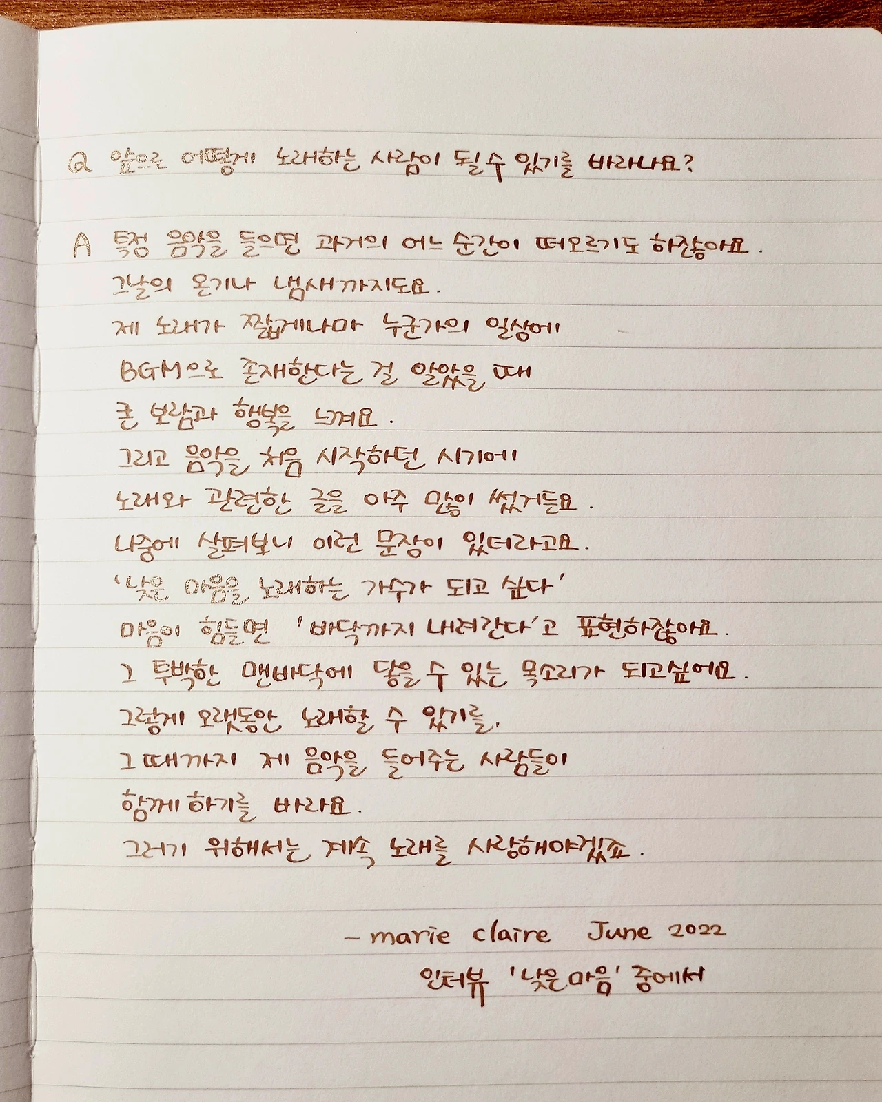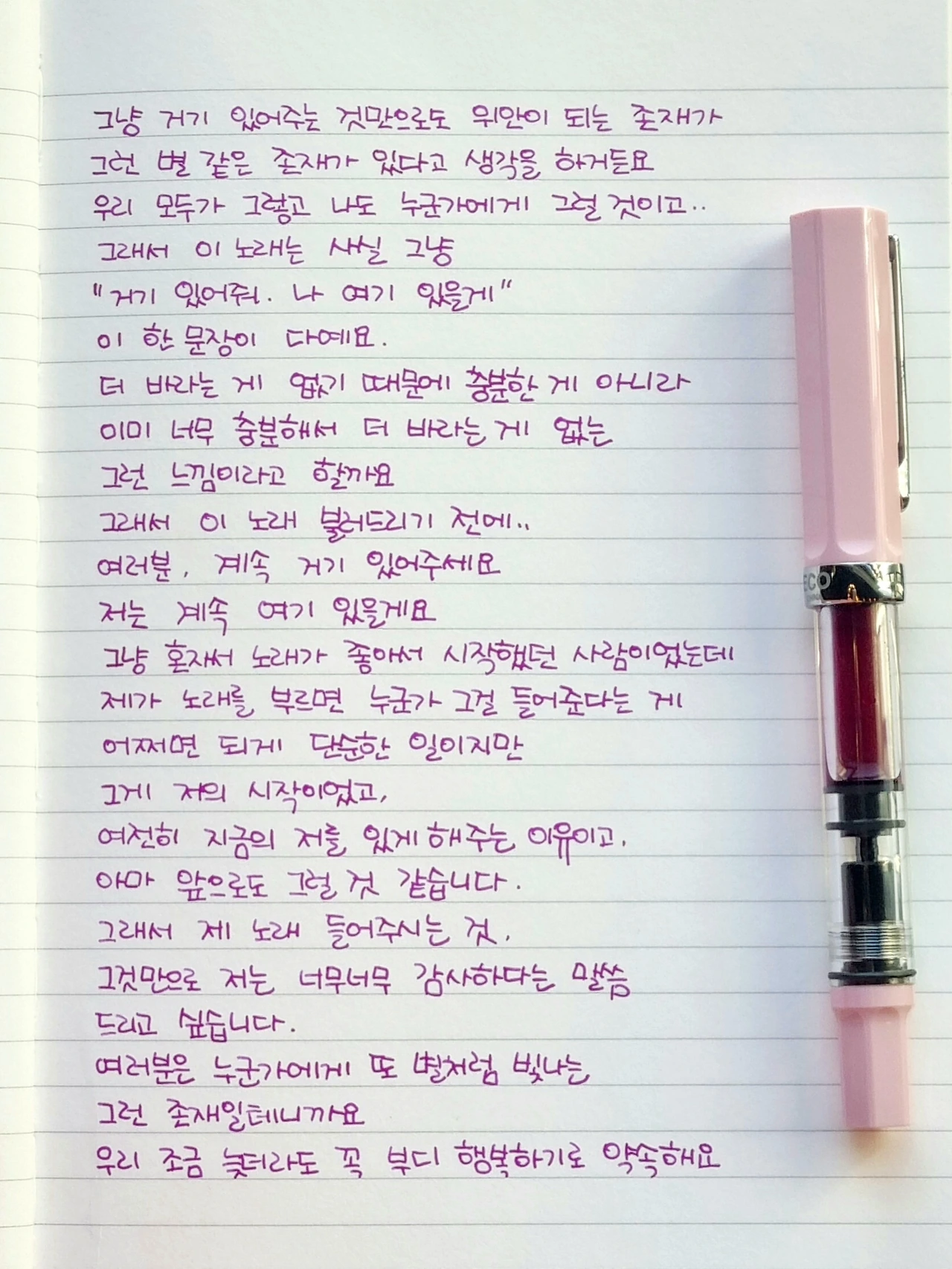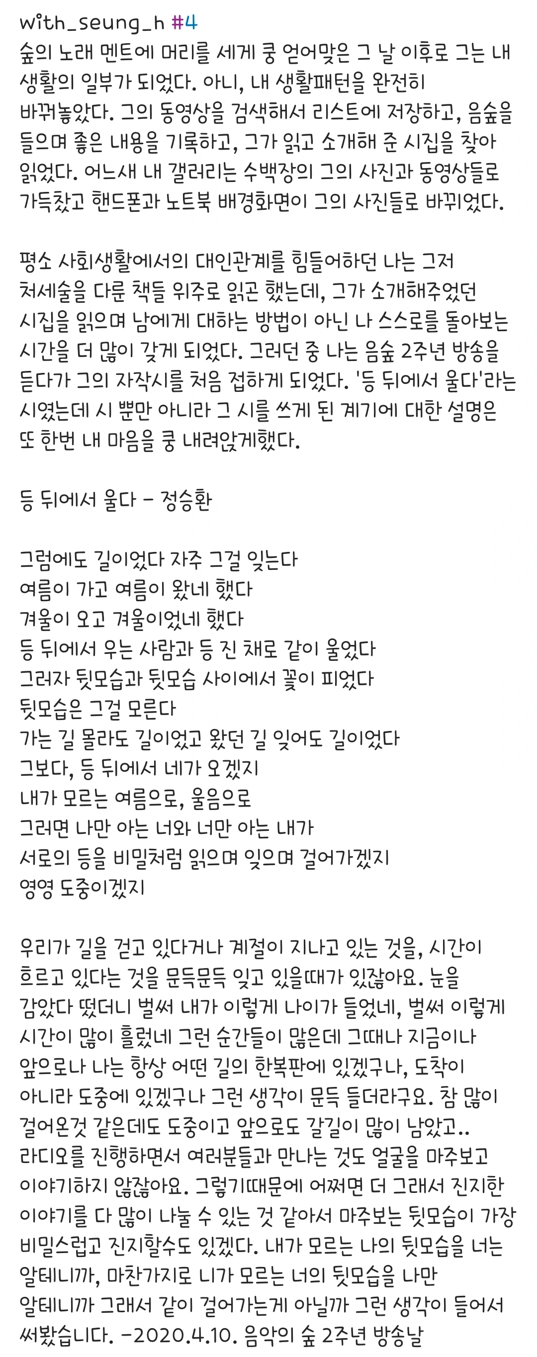 기운 없이 누워있던 상태로 할 수 있던 건 음악을 듣는 일뿐이었는데 그때 도망가자라는 커버곡을 부르던 정승환의 목소리에 위로를 받고 예전에 진행했던 라디오를 다시 듣기 시작했다. 사람에 대한 미움이 마음속에 가득하던 나에게 아직까지도 가장 영향력 있게 다가왔던 말이 바로 '나를 괴롭히는 사람을 긍휼히 여기라'는 말이었다. 긍휼히 여긴다는 말은 기독교에서 쓰는 말인데, 간단히 말해 '불쌍히 여긴다'는 말. 남을 괴롭히느라 인생을 낭비하며 사는 사람을 보며 '남을 미워하며 사는 인생 참 불쌍하다' 하고 생각하면 마음이 정말 편해졌고, 미워하는 마음들을 스스로 다스릴 수 있게 됐다. (그렇게 어쩌다 보니 지금은 팬카페 매니저를 3년째 하고 있다.) 이런 과정들을 글로 남겨두고자 '덕질일기'를 쓰기 시작했다. 파도치던 감정들을 글로 적으며 내 마음을 좀 더 깊게 들여다보는 기회를 가지게 되었다.