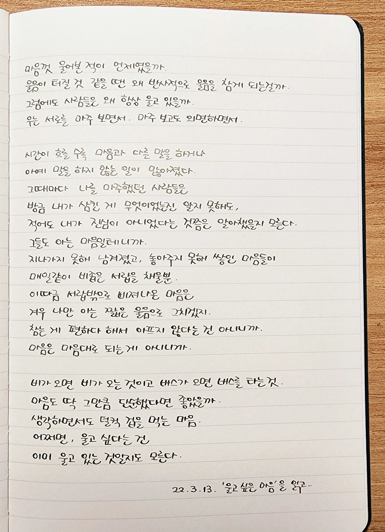 그의 말과 글을 필사하게 된 것도 이때부터였다. 필사라는 게 뭔지 몰랐던 시절, 글을 옮겨 적는 것 또한 마음의 위안이 되고 생각을 정리해 주는 계기가 될 수 있다는 걸 알게 되었다. 필사를 하고, 그에 대한 생각도 덧붙였다. 그렇게 점점 마음이 잔잔해졌다.