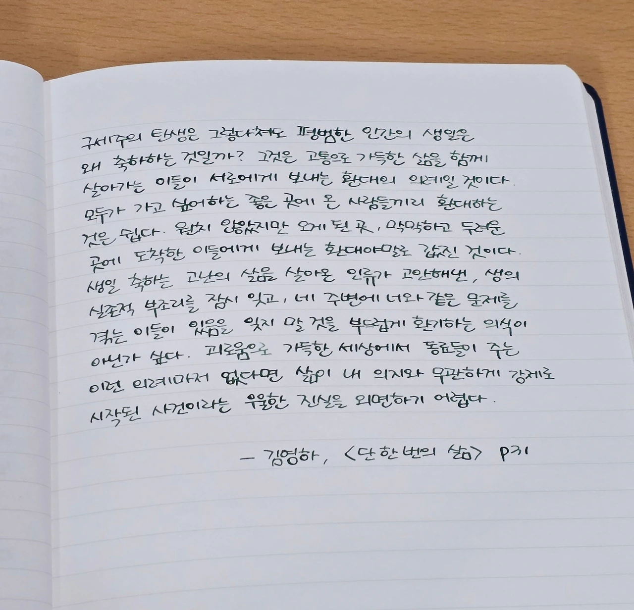 "구세주의 탄생은 그렇다고 쳐도 평범한 인간의 생일은 왜 축하하는 것일까? 그것은 고통으로 가득한 삶을 함께 살아가는 이들이 서로에게 보내는 환대의 의례일 것이다. 모두가 가고 싶어 하는 좋은 곳에 온 사람들끼리 환대하는 것은 쉽다. 원치 않았지만 오게 된 곳, 막막하고 두려운 곳에 도착한 이들에게 보내는 환대야말로 값진 것이다. 생일 축하는 고난의 삶을 살아온 인류가 고안해 낸, 생의 실존적 부조리를 잠시 잊고, 네 주변에 너와 같은 문제를 겪는 이들이 있음을 잊지 말 것을 부드럽게 환기하는 의식이 아닌가 싶다. 괴로움으로 가득한 세상에서 동료들이 주는 이런 의례마저 없다면 삶이 내 의지와 무관하게 강제로 시작된 사건이라는 우울한 진실을 외면하기 어렵다."