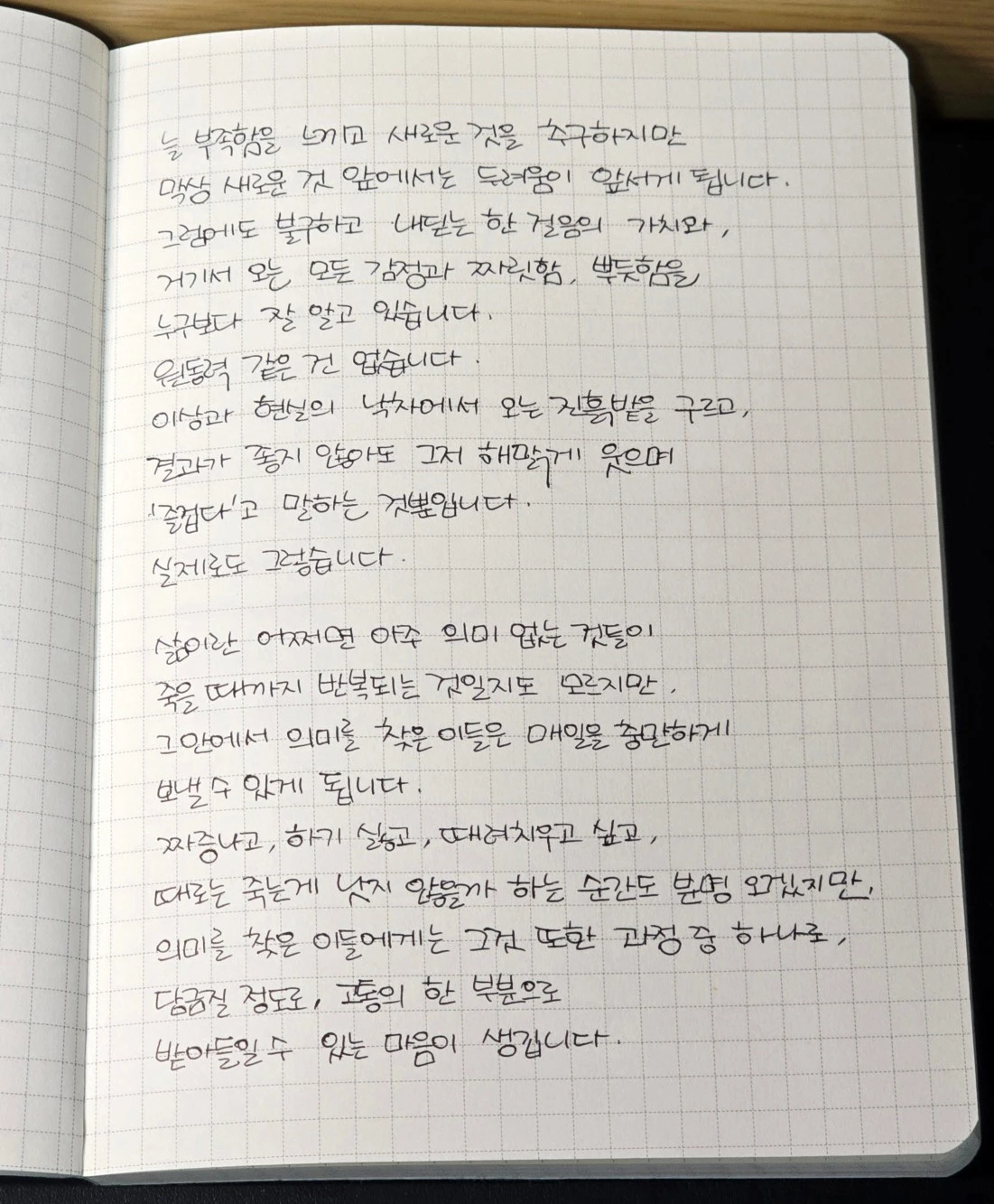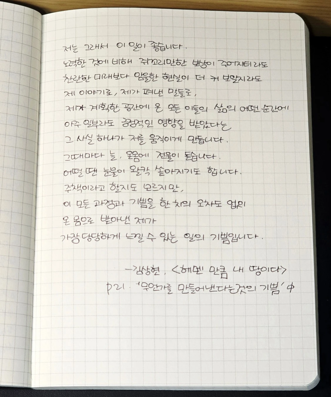 저는 그래서 이 일이 좋습니다. 노력한 것에 비해 쥐꼬리만한 보상이 주어지더라도 찬란한 미래보다 암울한 현실이 더 커 보일지라도 제 이야기로, 제가 펴낸 말들로, 제가 계획한 공간에 온 모든 이들의 삶의 어떤 순간에 아주 일부라도 긍정적인 영향을 받았다는 그 사실 하나가 저를 움직이게 만듭니다. 그때마다 늘, 온몸에 전율이 돌습니다. 어떨 땐 눈물이 왈칵 쏟아지기도 합니다. 주책이라고 할지도 모르지만, 이 모든 과정과 기쁨을 한 차의 오차도 없이 온몸으로 받아낸 제가 가장 당당하게 느낄 수 있는 일의 기쁨입니다.