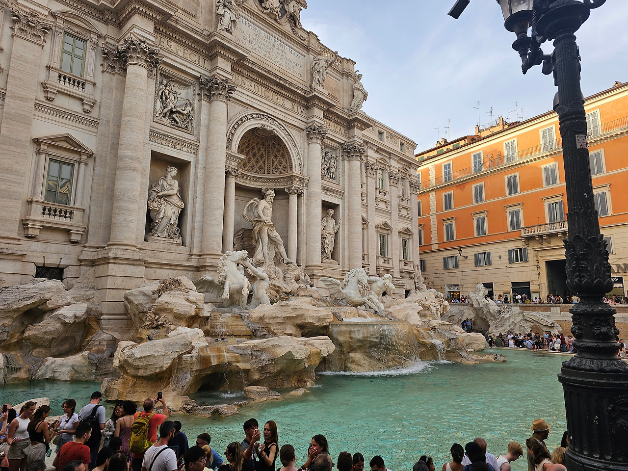 사실 분수 색깔도 아름다웠지만, 가운데에 있는 조각상이 더 눈에 들어왔다. 남편이 16년 만에 다시 온 판테온과 트레비 분수, 스페인 광장까지. 판테온은 고대 로마시대 건축물인데 후에 성당으로도 이용됐다. 나보나 광장엔 그림 그리는 사람들이 많아서 신기했고 남편은 트레비에서 또 한 번 동전을 던졌다. 그때 두 개를 던졌기에 평생의 연인을 만날 수 있었던 것이야! 트레비 분수 색깔은 오묘해서 아름다웠고 사람들은 엄청나게 많았다. 분수 색깔도 예뻤지만 가운데에 있는 조각상이 우아해서 눈에 들어왔다. 바다의 신 넵튠(포세이돈)과 그 주변에 반신반어인 트리톤이 두 마리의 말을 이끌고 있다.