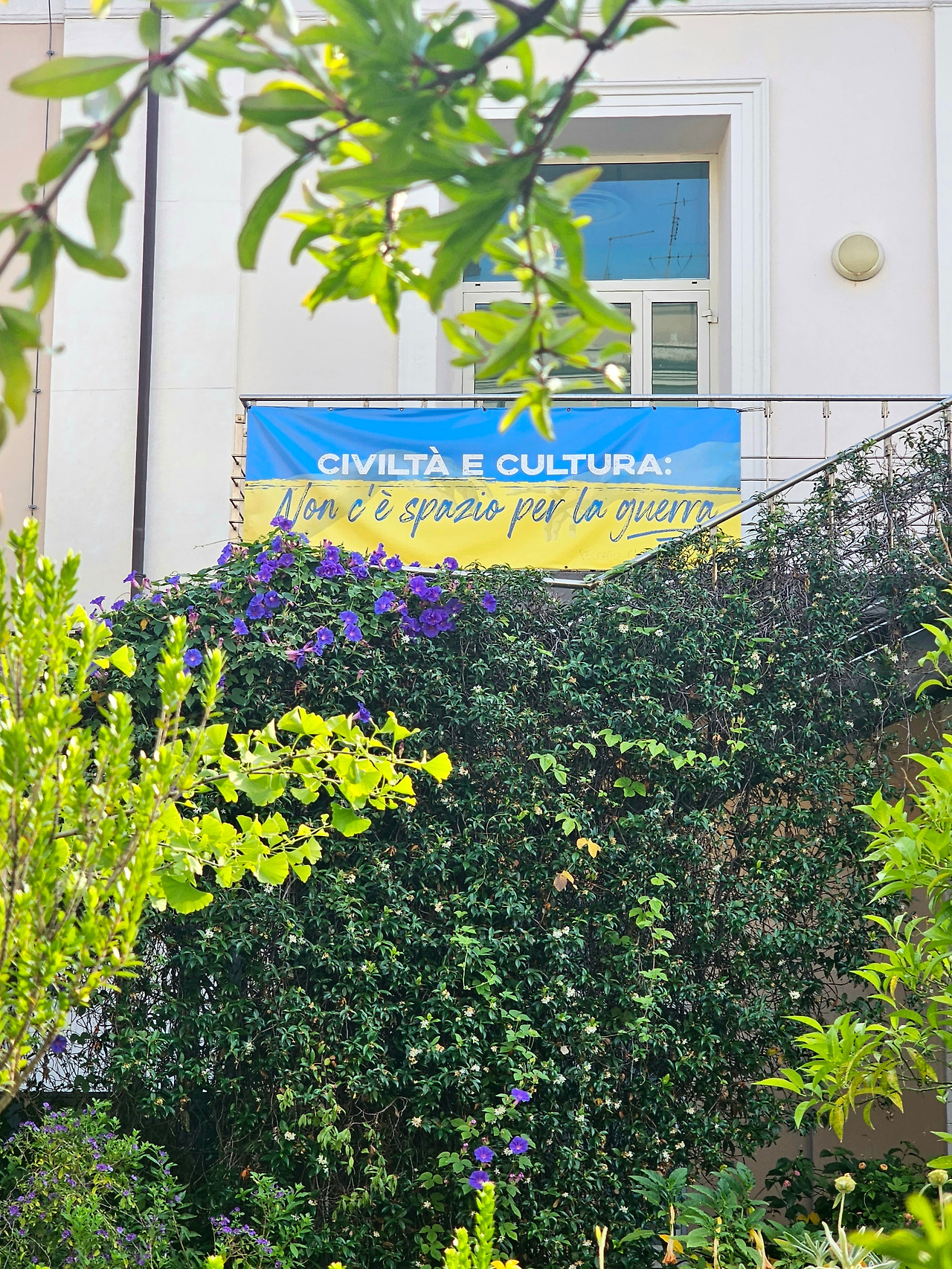 라 사피엔차 대학교에 걸려있던 우크라이나 국기. 전쟁의 여지는 없다라는 이탈리아어 말이었다. 하지만 오랜만에 전날밤 느끼한 것을 먹어서 그런지 밤새 화장실에 들락날락해 버렸다. 우리는 커피 투어로 여행을 마무리하기로 했다. 바리스타 출신 가이드님께 추천받은 타짜도르 커피, 그리고 산미가 조금 있다는 산트 유스타치오 더 커피 두 곳 모두에서 커피콩을 구매했다. 이로써 일리 커피 포함 이탈리아 3대 커피집을 모두 뚫었다. 젤라또 맛집이라는 지올리티에 가서 남편이 좋아하는 맛도 먹었다. 커피투어를 하면서 판테온과 트레비분수도 다시 마주했고 베네치아 광장도 지나쳤다. 콜로세움을 바라보면서 좀 쉬다가 공항버스를 타고 출발했다.