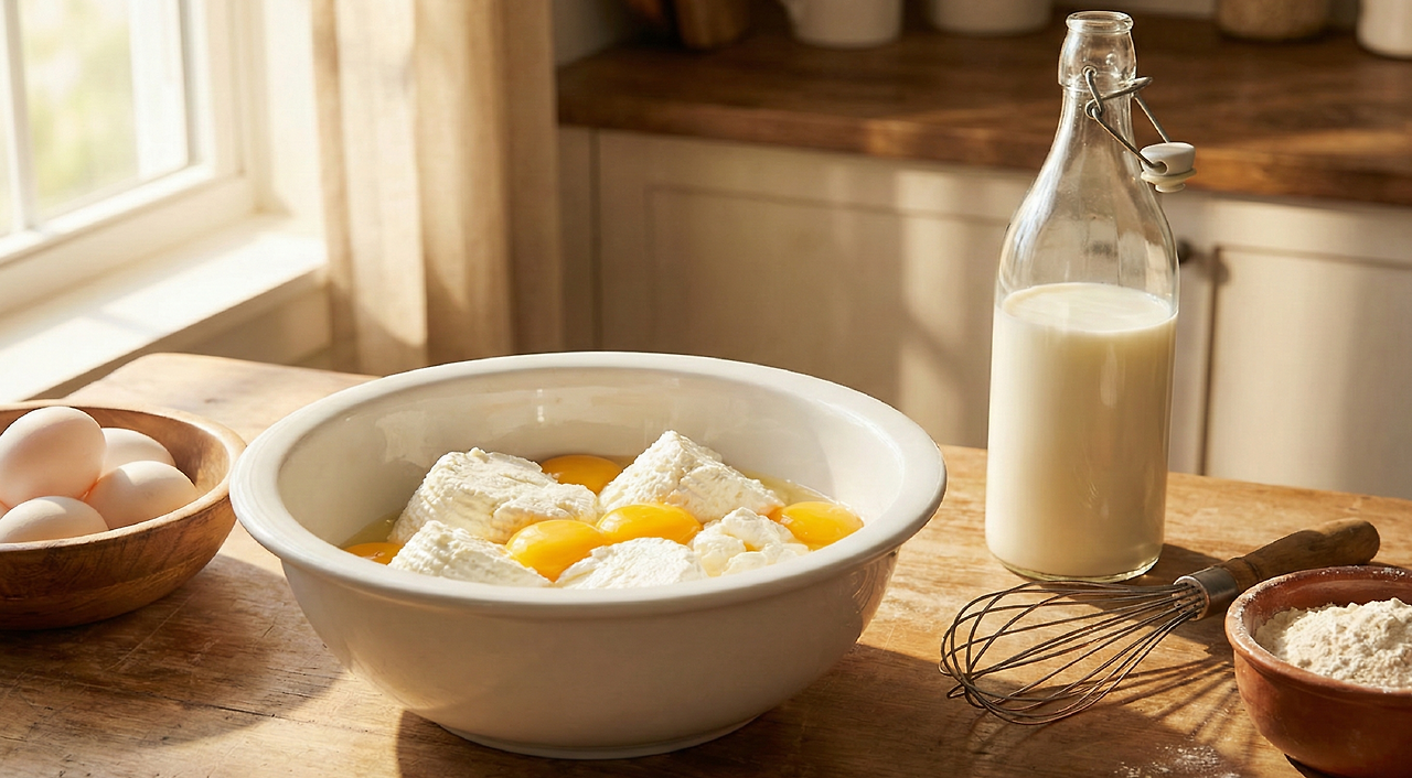 반죽하기: 볼에 리코타 치즈, 우유, 계란 노른자를 넣고 가볍게 섞습니다. (치즈 덩어리를 남겨두세요!) 체 친 밀가루와 베이킹파우더를 넣고 섞습니다.