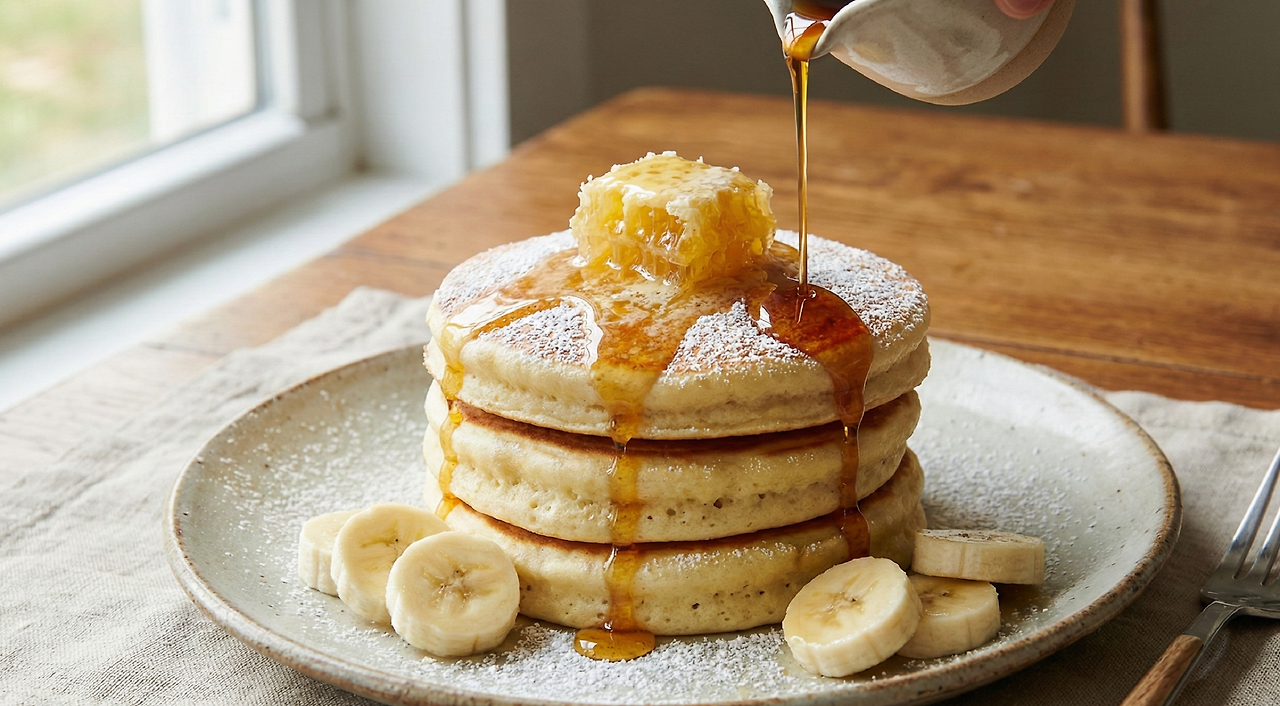 잘 구워진 핫케이크를 접시에 담고, 미리 만들어둔 '허니콤 버터(Honeycomb Butter)' 한 조각을 무심하게 툭 올린다. 뜨거운 열기에 버터가 사르르 녹아내리며 황금빛 강을 만든다. 그 위로 슈가 파우더를 눈처럼 뿌린다. 바나나 한 조각과 함께 핫케이크를 입에 넣는다. 씹을 필요도 없다. 입안에 넣자마자 솜사탕처럼, 혹은 구름처럼 녹아 없어진다.