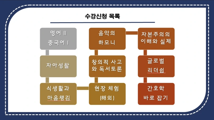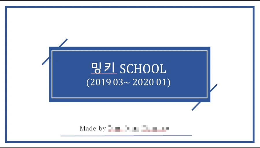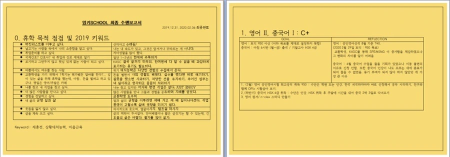 성격상 다 내려놓고 노는 것도, 꼭 한가지에만 몰입하는 것도 어려워해서 방향을 잡는 데 시간이 걸렸다. 규칙적인 생활로, 배우고 싶었던 것들을 하며 시간을 보낼 수 있을까 고민하다 평소 좋아하던 네이버 블로거 (소히월드) 님의 아이디어를 벤치마킹하여 2019년 3월, 나만의 학교 밍키 SCHOOL을 만들었다. 총 10+1개월 동안 운영되는 이 학교는 수업시간표, 커리큘럼, 성적 관리 모두 내가 담당하며, 학생도 오직 나 한 명이다. 수업시간은 유동적이며, 매 분기마다 피드백을 진행하고 부족했던 과목은 다음 분기에 더 시간을 쏟기로 했다. (1분기 : 3월-7월, 2분기 : 8월 - 12월, 3분기 : 2020년 1월) 수강 과목은 2학점을 기본으로 하며, 시간이 많이 요구되는 글로벌 리더쉽, 현장실습(해외) 과목은 3학점으로 설정하였다. (총 20학점)