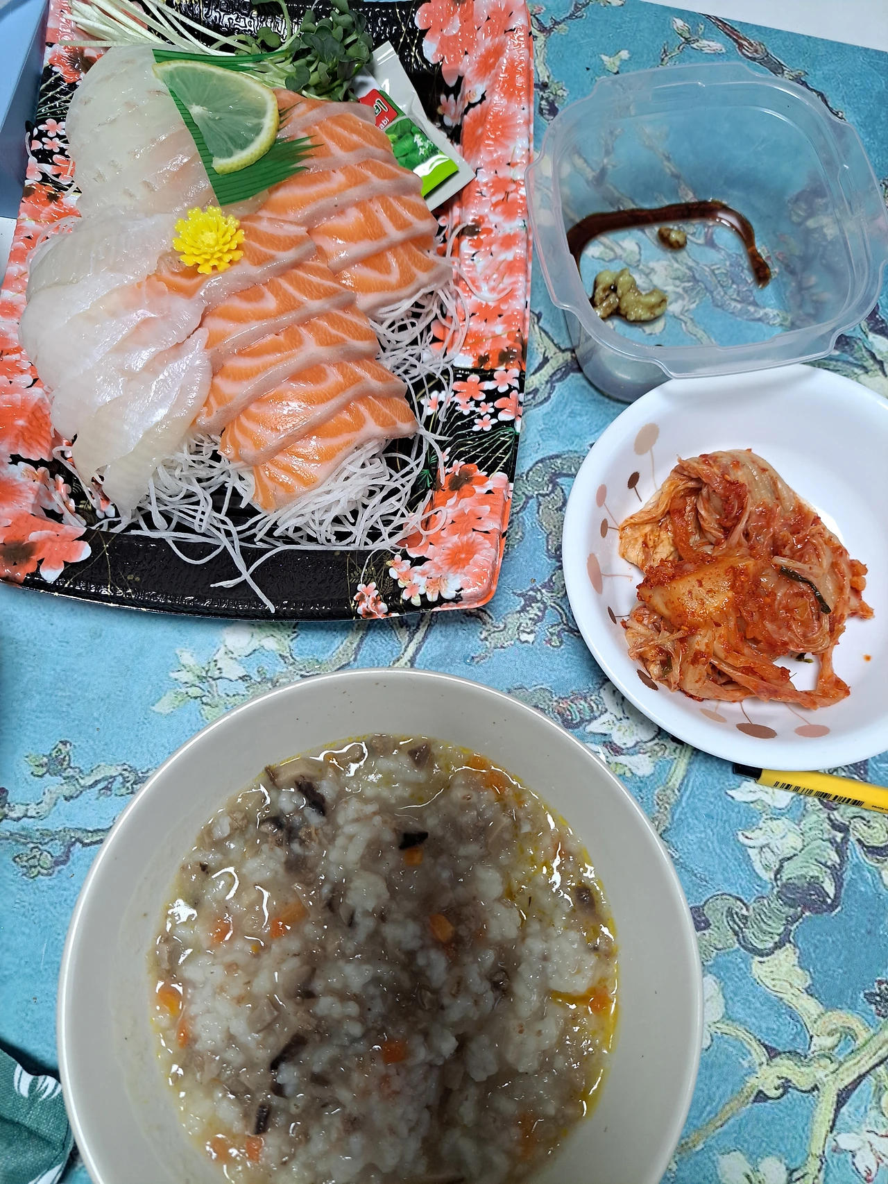 몸이 안좋은 날에는 회 사서 죽이랑 (조합무엇?) 먹었다.