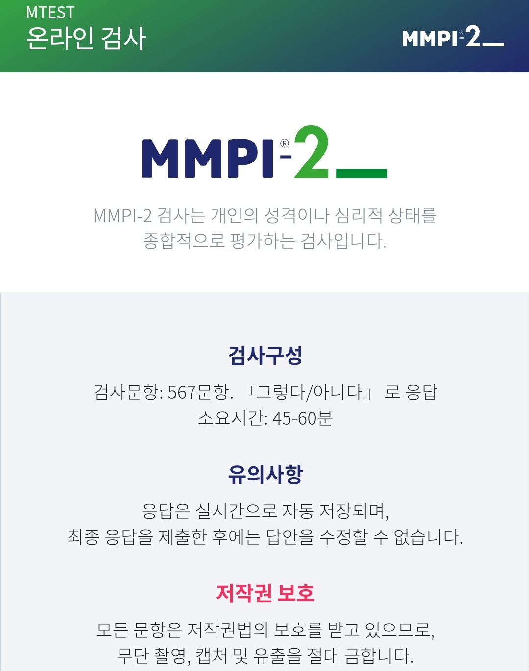 오늘은 지난번 온라인으로 검사했던 TCI, MMPI, 문장완성검사를 확인하는 날이다. 결론적으로는 무난한 상태.