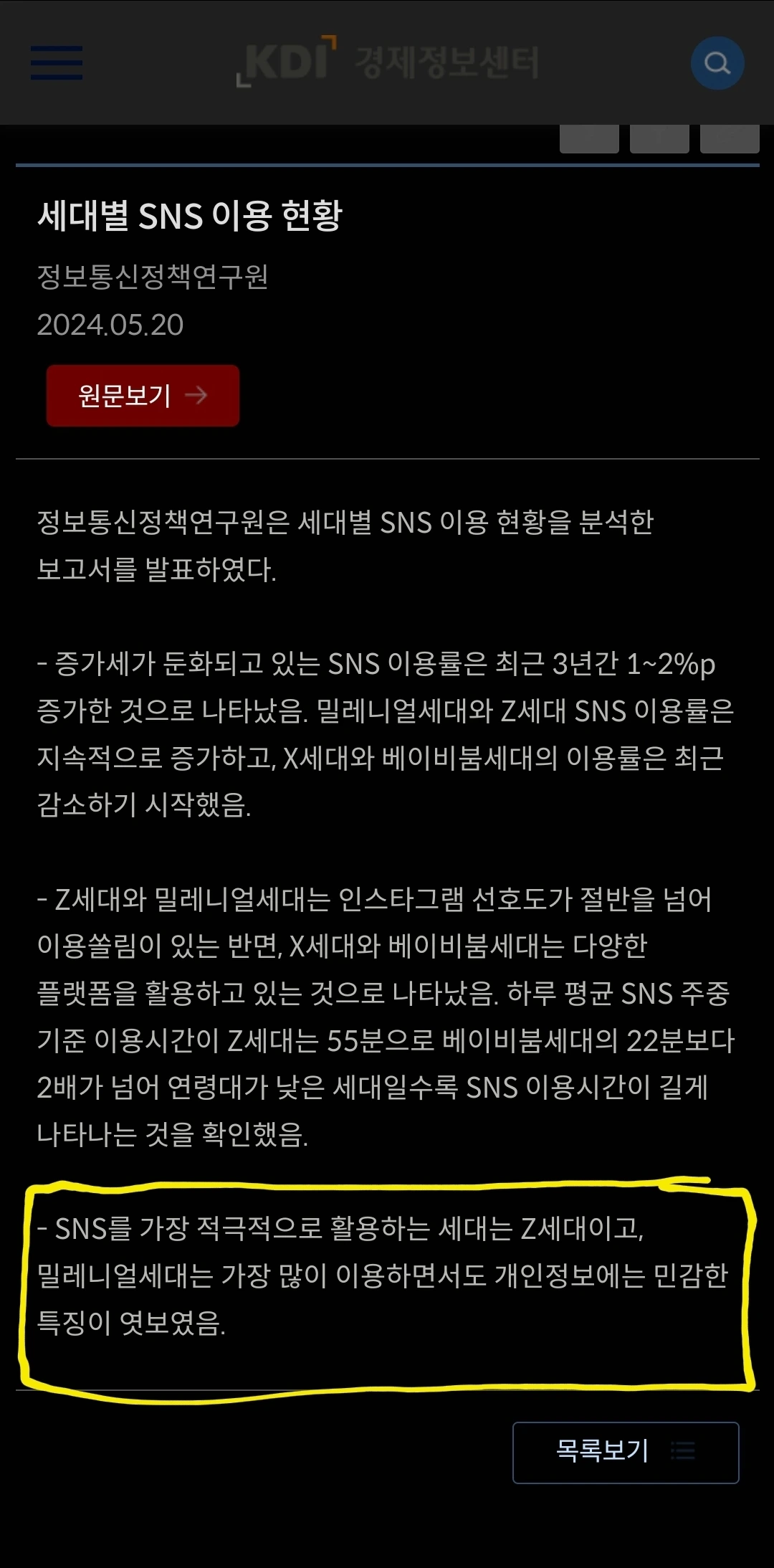 KDI연구에 따르면 밀레니얼 세대에서는 개인정보 우려를 품고 SNS를 사용한다고 한다.