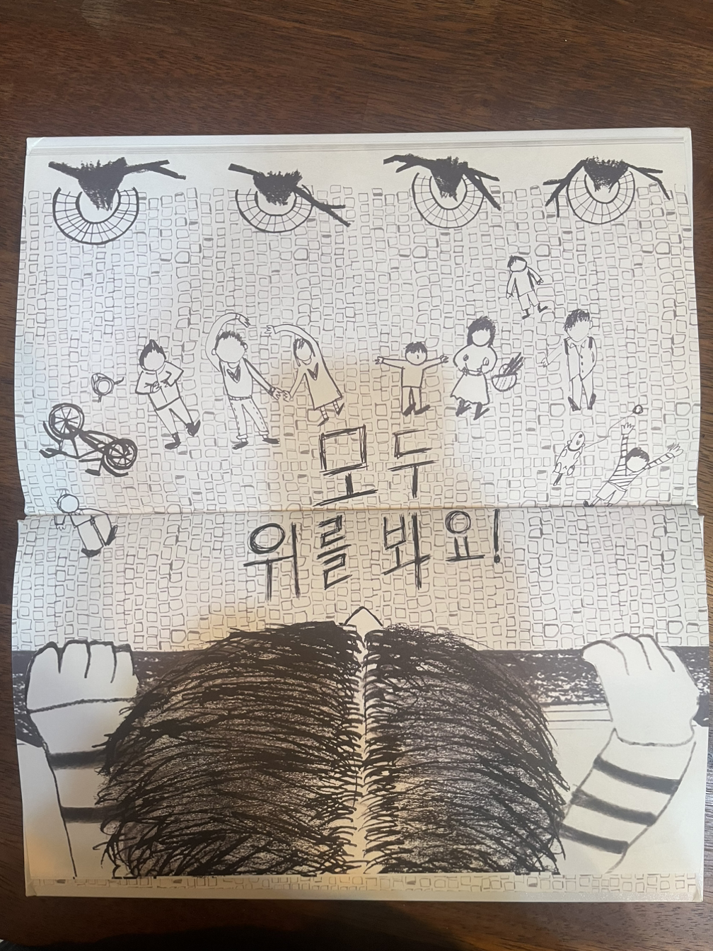 《위를 봐요!》에 나오는 수지도 그런 상태에 놓여 있다. 가족 여행 중에 교통사고를 당해 다리를 잃은 수지는 밖에 나가지 못하고 창밖으로 지나다니는 사람들을 내려다보며 시간을 보낸다. 그런데 위에 있는 수지가 아래에 있는 사람들을 보자니 온통 까만 머리뿐이다. 사람들이 웃고 있는지 찡그린 표정인지 알 수 없고 그냥 까만 개미처럼 보인다. 묵묵히 지켜보던 수지가 소리친다.