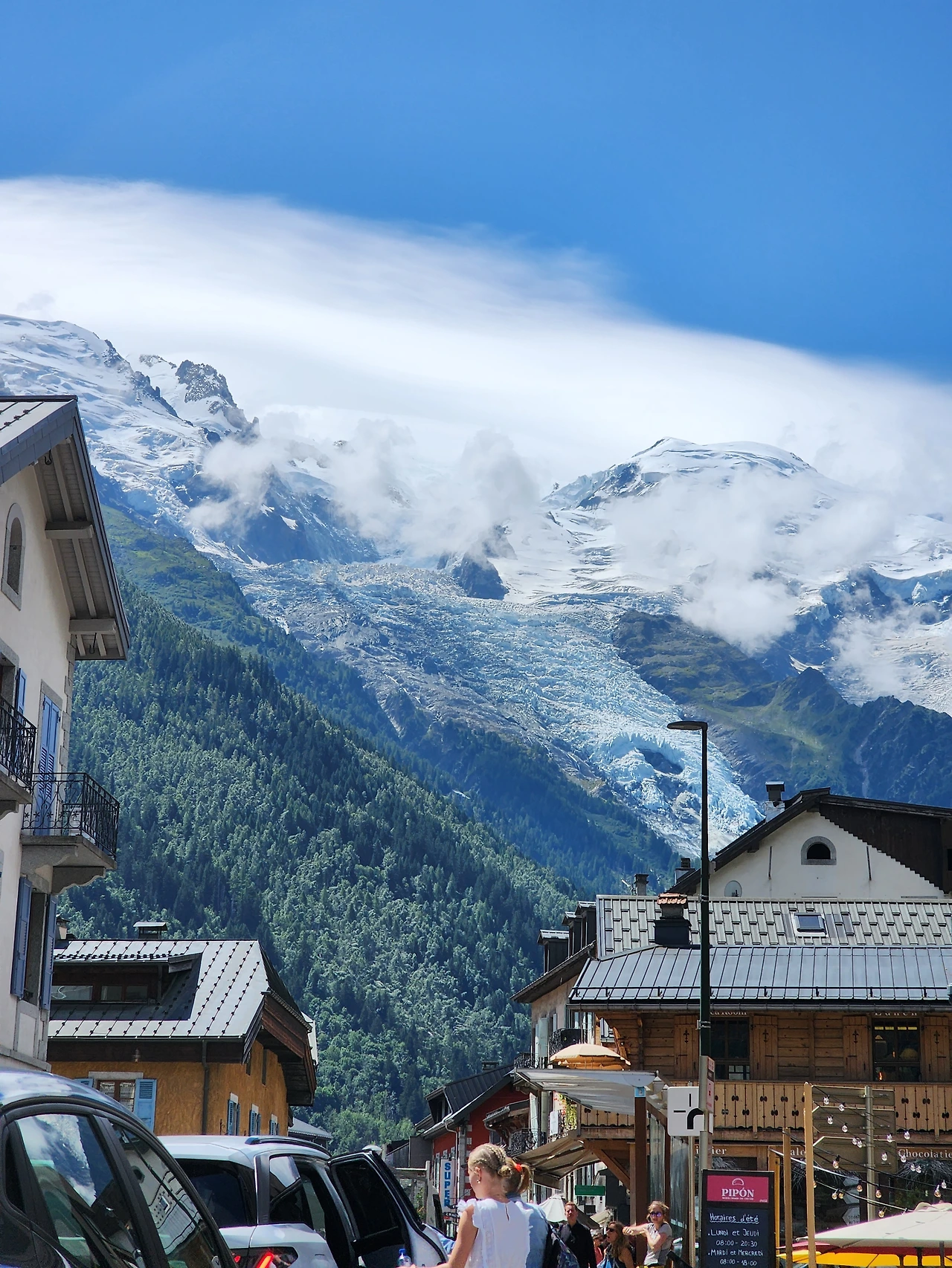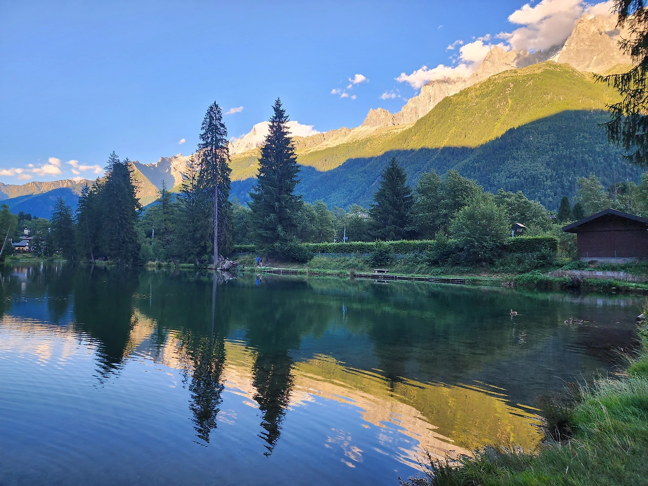 날씨는 눈부시고 하늘 위 구름조차 이국적으로 보였다. 시내를 감싸고도는 옥색 물빛(빙하가 녹은 물) 하천과 바로 눈앞에 설산인 몽블랑 정상이 버티고 있어 이곳이 샤모니라는 걸 알려주었다.