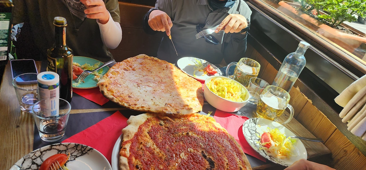 꾸르마이외르에 도착하니 날씨가 화창한 점심 무렵이다. 맛집 정보를 알고 찾아가는 대장을 따라 피자집에 들어갔다. 접시에 다 담기지도 못할 만큼 크고 납작한 피자가 이곳이 이탈리아라고 말해주는 듯하다. 이탈리아 피자는 이렇구나 싶어 새롭기도 하고 맛도 좋았다. 넷이서 두 개의 피자를 다 먹지도 못할 만큼 양이 많았는데 현지인들은 1인 1 피자를 접시에 담아 먹고 있어 신기했다.