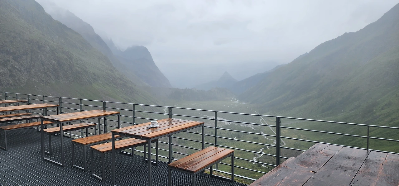 저녁 식사를 위해 식당으로 내려오자 숙소를 예약하지 못한 트래커가 산장 출입구에서 비를 피하는 모습이 보였다. 저녁 7시가 넘고 비바람이 거세자 그는 입구 발코니에서 밤을 지새울 모양인지, 텐트를 치기 시작한다. 산장을 예약하지 못했다면 우리도 저와 같았을 거라고 일행 모두 이구동성으로 말했다.
