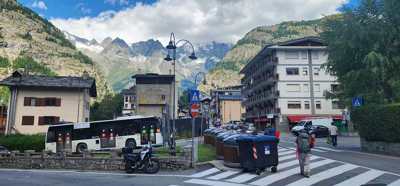 이른 아침부터 엘리자베타 산장을 나와 얼마나 걸었을까? 둘레길이 끝나는 지점에 자동차 도로가 있다. 도시 관광세로 운영되는 무료 셔틀버스를 타는 곳에서 한참을 기다려 꾸르마이외르로 가는 버스를 탔다. 버스 안에서 혼자 여행하는 26세의 잉글랜드 여자를 만났다. 간단한 영어로만 소통할 수 있어 아쉬웠다. 그녀는 키도 크고 이목구비도 예뻤지만, 혼자서 TMB를 도전하는 모습이 더 멋있고 아름다웠다.