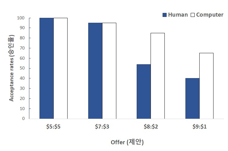 만약, 불공정한 제안을 사람이 아니라 기계가 하면 어떻게 반응할까? 똑같은 불공정한 제안도 컴퓨터가 하면 사람이 할 때보다는 제안을 받아들이는 비율이 더 높은 것으로 나타났다(Sanfey, 2003). 상대가 사람이 아니면 감정을 줄이고 그나마 합리적으로 판단한다.