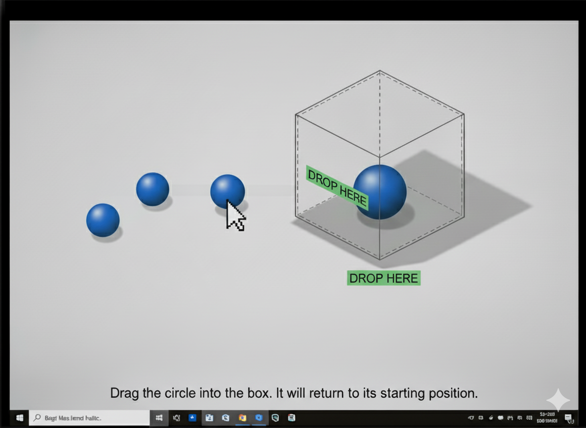 컴퓨터 화면 왼쪽에 작은 원이, 오른쪽에 사각형 박스가 있다. 원을 마우스로 당겨서 사각형 박스에 넣으면 박스에 들어간 원은 사라지고, 원래 위치에 새로운 원이 나타나는 단순한 게임이 프로그램되어 있다.
