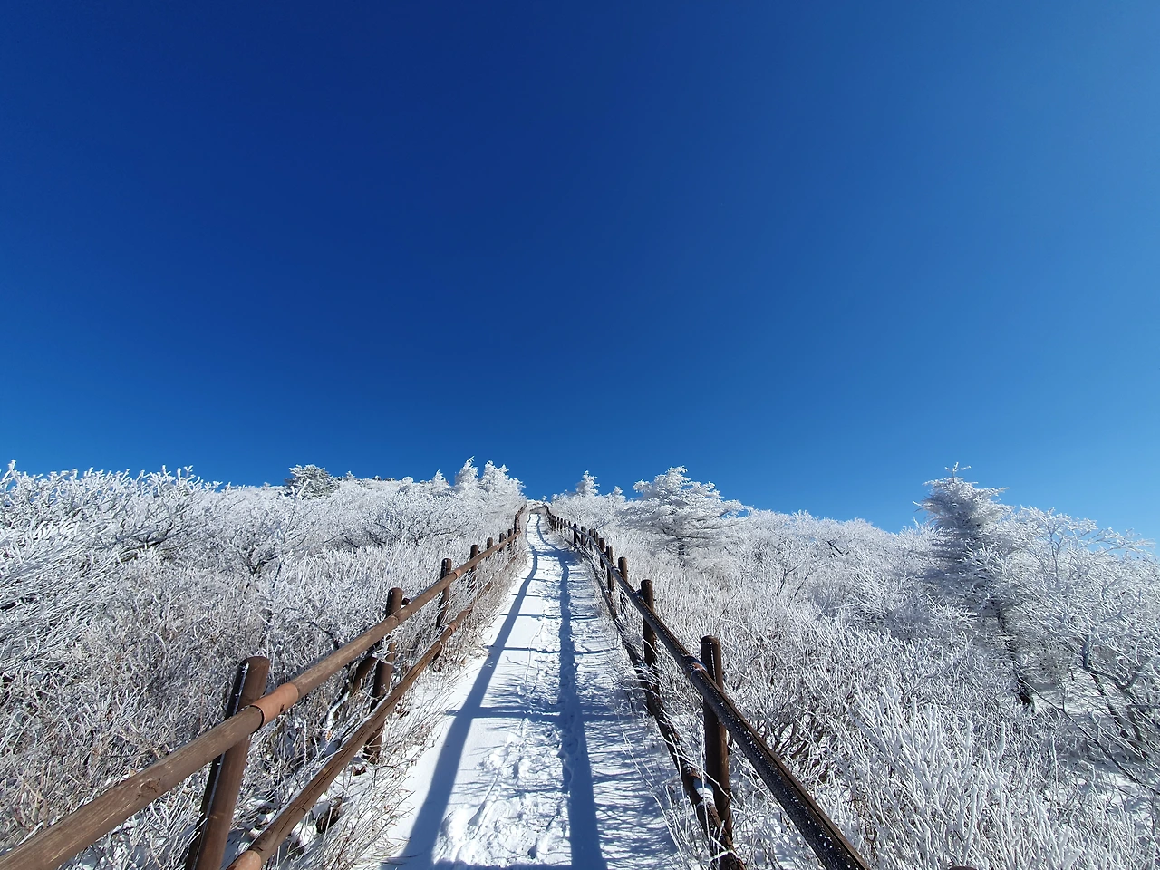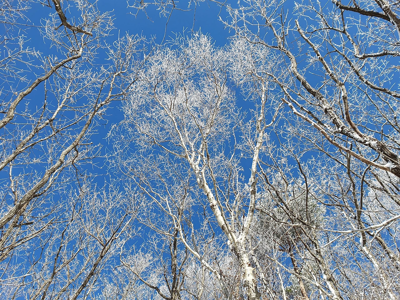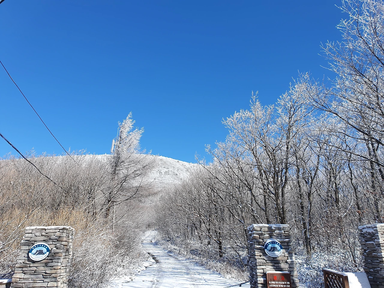현실 같지 않은 선명하게 파란 하늘이다. 얼어붙은 눈이 하얗게 감싼 자작나무 사진을 찍었다. 좁고 가파른 등산로를 거쳐 산 정상에 올라왔지만, 다시 그 길로 내려가면 미끄러울 것 같아 콘크리트 포장도로로 멀리 돌아서 가기로 했다.