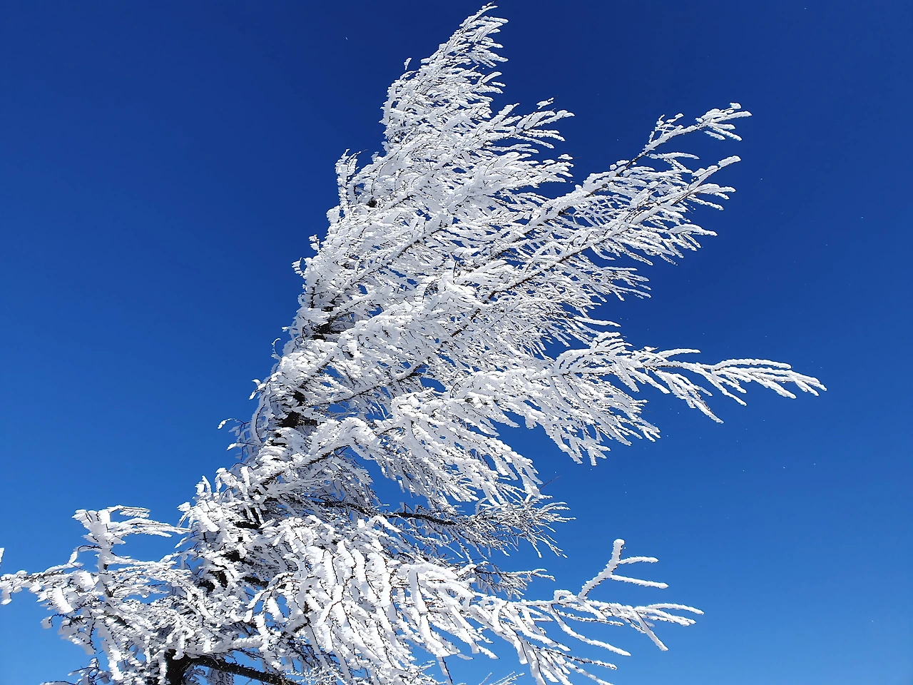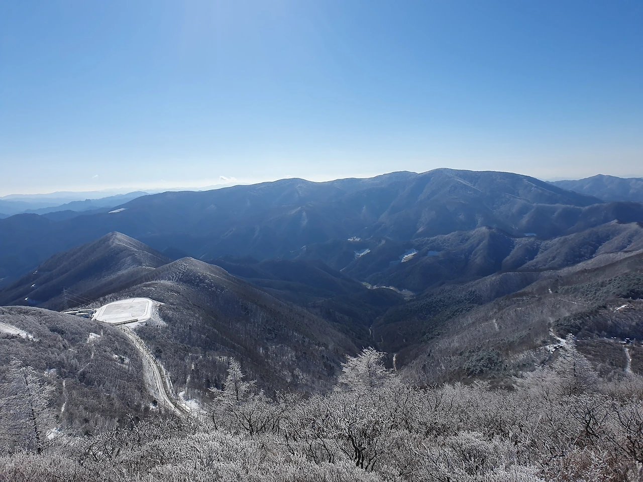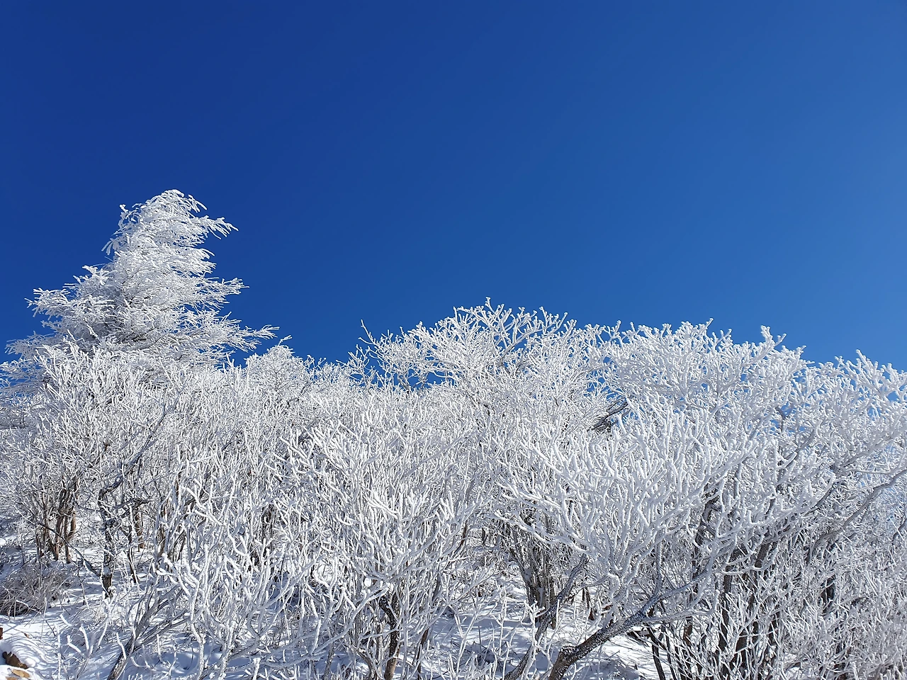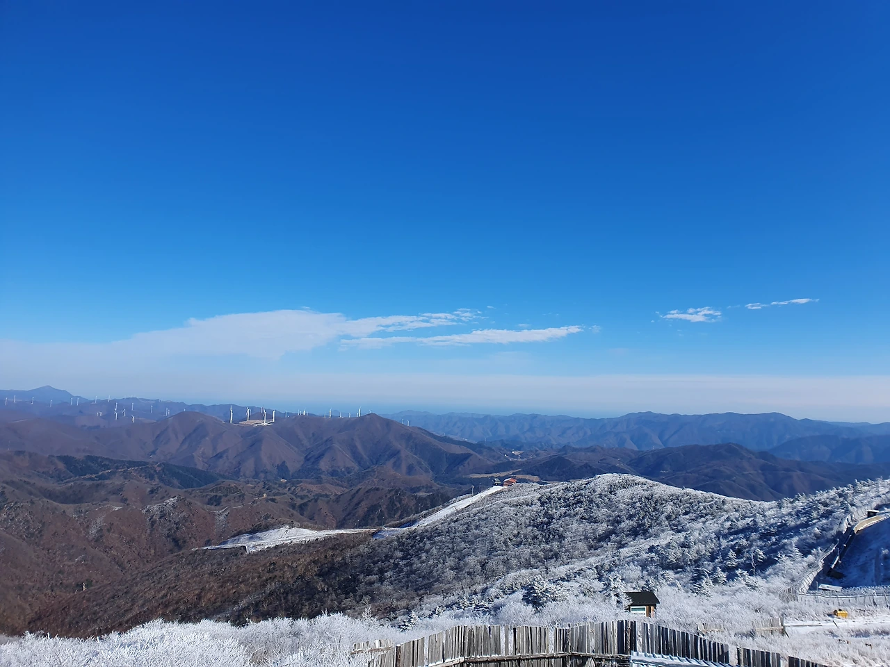 현실 같지 않은 선명하게 파란 하늘이다. 얼어붙은 눈이 하얗게 감싼 자작나무 사진을 찍었다. 좁고 가파른 등산로를 거쳐 산 정상에 올라왔지만, 다시 그 길로 내려가면 미끄러울 것 같아 콘크리트 포장도로로 멀리 돌아서 가기로 했다.