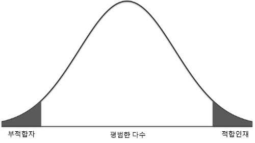 이러한 관점에서 입사지원자의 역량 수준 분포를 그림으로 그린다면 다음과 같이 나타낼 수 있다. 입사지원자는 이렇게 어느 정도 종모양의 정규분포를 이루고 있고, 평범한 인재가 대부분의 면적을 차지하고 있다. 그리고 일부 소수 우수인재와 부적합자들이 양쪽 꼬리에 위치하고 있다.