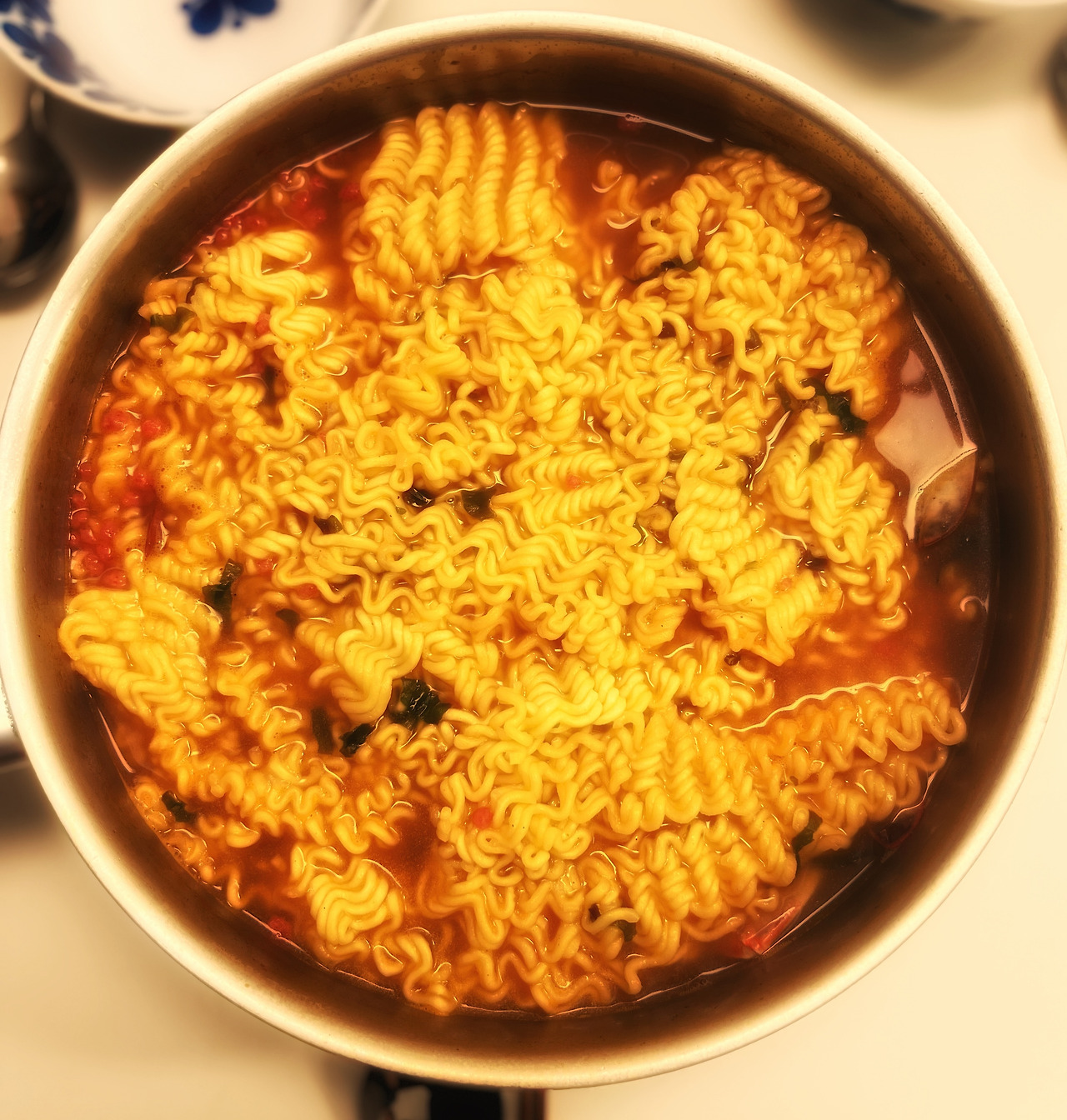 동시에 완성된 볶음밥과 꽃게라면을 보니, 속초 청초호 어딘가에 있는 꽃게 무한 리필집 같다.