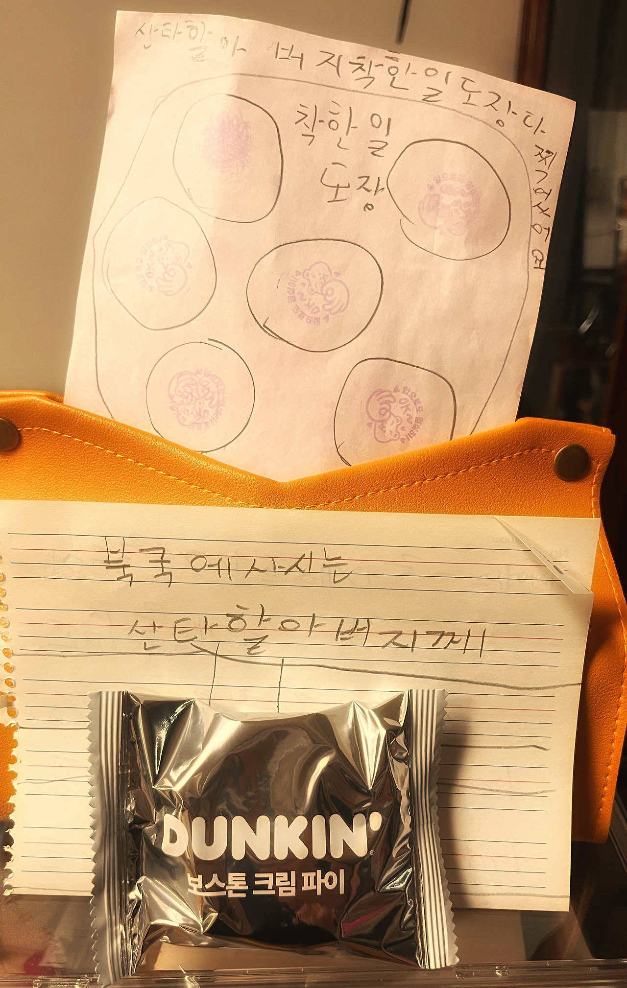 선물이 너무 받고 싶었나 보다. 얼른 편지와 초코파이를 치우고, 산타할아버지의 답잡을 준비했다.
