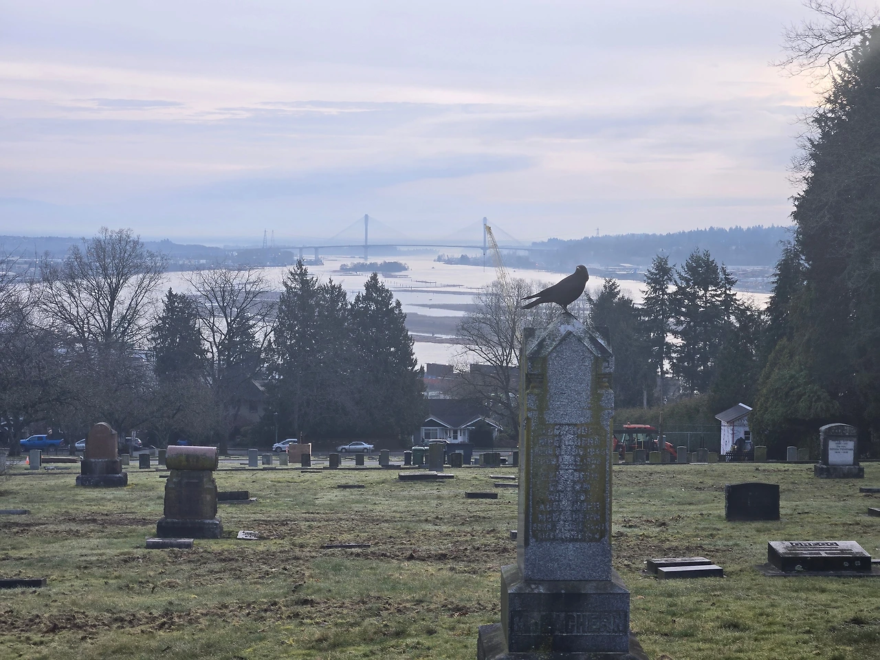 어느날 아침, 비석위에 서서 나를 환영하는 까마귀를 본다. 저 멀리 다리가 보인다. 도시와 도시를 잇는 브리티시콜롬비아주에서 가장 큰 다리이다.