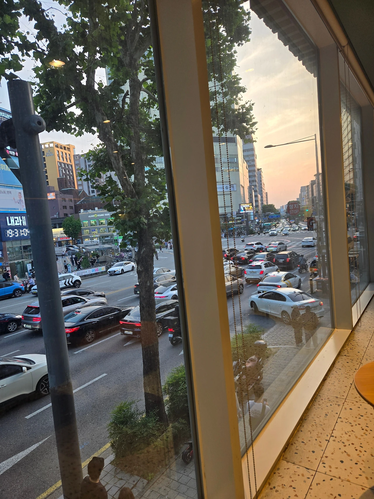 창가에 앉아 지나가는 차들을 보며 사가리를 건너가는 다양한 사람들의 모습을 멀리 지켜본다.