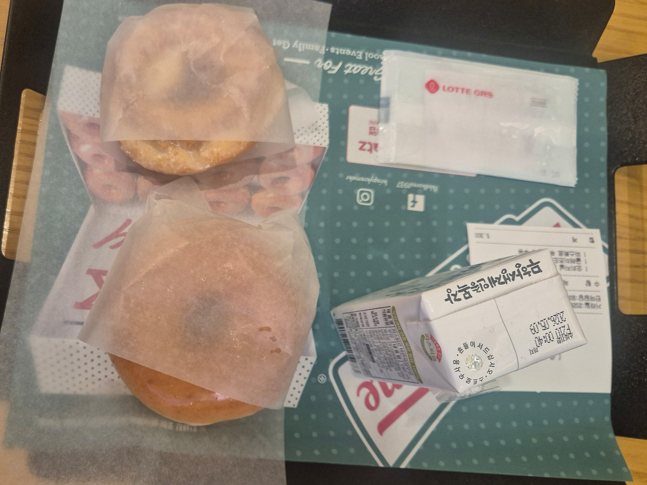 집에 바로가기 싫어 버스정류장 앞에 있는 크리스피도넛가게에 왔다. 커피와 도넛 세트가 5,200원이었는데 가격을 그 이상은 너무 훌쩍 넘기고 싶지 않아서 다른 메뉴를 구경한다. 일하면서 커피를 많이 먹기도 했고 , 도넛도 더 먹고 싶어서였다. 그래서 음료항목에 무항생제 우유를 조합시키니 도넛 두 개를 넣을 수 있었다.