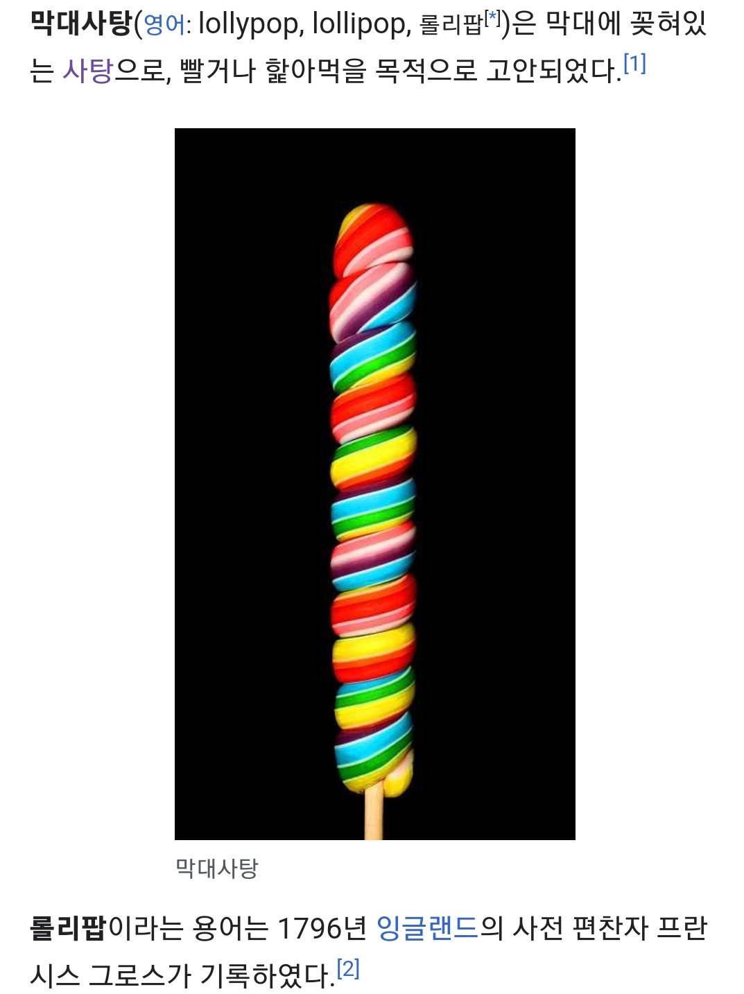 막대사탕은 막대에 꽂혀있는 사탕입니다. 영어로 롤리팝이라 하는데, 영어 명칭 마저도 사탕이 주는 느낌처럼 즐거움 그리고 통통 튀며 달콤 귀여운 어감이네요.