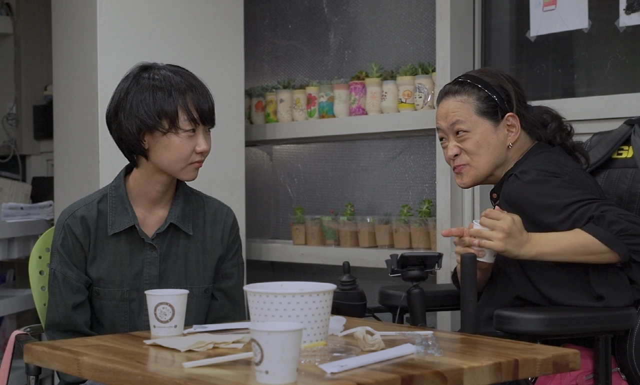 영화가 신체를 쓰는 방식은 주체 각자의 역할과 범주에 균열을 일으키는 독특한 구성으로 이루어진다. 허리가 안 좋은 성희는 유독 눕거나 앉아있는 장면이 많다. 그 가운데서도 어딘가에 기대거나 지지할 곳은 마땅치 않다. 성희가 그 모든 고통을 견디는 방법이라면 홀로 그 모든 감각을 삭히고 버티는 것 외에는 다른 방도가 없어 보인다. 이와 다르게 장애인 야학의 학생들이 발산하는 역동성은 우리에게 도움이 필요한 존재는 누구인가에 대한 고민을 던진다. 특히 장애인의 삶을 대하는 〈에듀케이션〉의 두 시선이 보여주는 움직임의 대비로 말미암은 파동은 눈에 보이지 않는 사람과 사람 사이의 관계에도 적용된다. 영화는 현목 어머니라는 인물로 대변하는 정물적 기능과 함께 은진이라는 인물이 가진 적극적인 생명력과 유머를 교차한다. 이로써 장애인과 비장애인을 가르는 관객의 시선은 분열되고 그 틈 사이 움직이지도, 가만히 있을 수도 없는 성희의 혼란스러운 마음은 갈피를 잡지 못한 채 존재한다. 야학 수업 시간에 음악에 맞춰 추는 성희의 격정적인 춤에 상대는 없다. 성희는 ‘헬조선’을 벗어나 새로운 삶을 꿈꾸지만, 그 안의 타인과 부딪치며 연결된 감정과 사람을 끝내 털어낼 수 없음을 이미 알고 있었을지도 모른다. 그런 성희를 향해 현목은 한결같이 기대며 도움을 요청한다. 관계의 스위치를 켜 준 현목은 다시 성희를 붙들어놓지만. 사람으로 축적된 감정은 여전히 억눌린 몸 안에 쌓여 통증만 안겨준다.