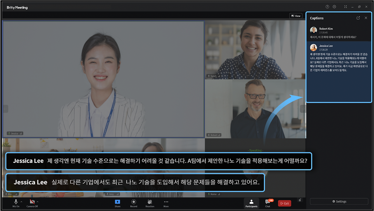 그리고 STT 기술 기반의 실시간 자막 기능을 제공하여, 혹시나 놓치는 내용이 없는지 점검할 수 있도록 도와준다. 외부에서 화상 회의에 참여할 경우, 정확히 안 들릴 때가 많다. 특히 해외 담당자와 대화할 경우 영어로 이야기하기 때문에ㅠ 상대방의 말을 잘 듣지 못하는 경우도 많은데! 브리티 미팅은 아래 이미지와 같이 화면 우측에 자막을 모아두어, 회의 중간중간에 쉽게 확인할 수도 있다. 화상 회의를 하다가 나도 모르게 놓치는 내용이 있을 때가 종종 있기에, 실시간 자막 기능은 정말 유용하게 잘 쓸 것 같다.