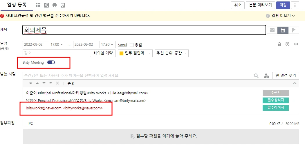 브리티 메일에서는 일정 > 일정 등록 > 일성 작성 창의 하단에서 Brity Meeting 탭만 켜면, 회의 참석자들의 메일만 추가하면 된다. 일정과 영상 회의가 동시 예약되는 개념!