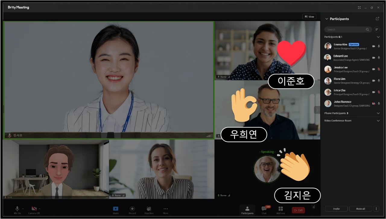 그리고 화상회의에서는 반응이 없으면 정말 무안하다. ㅠㅠ 마이크를 꺼놓고 발표자의 발표를 듣는 경우가 많다 보니, 이모지 기능이 얼마나 소중한지를 깨달았다. 다들 알았다는 의미로 고개를 끄덕이곤 하지만, 조금은 무안할 때가 있다. 이때 브리티 미팅에서는 이모지 리액션을 해주면서 쉽게 의견에 공감하고, 부드럽게 화상회의를 진행할 수 있다.