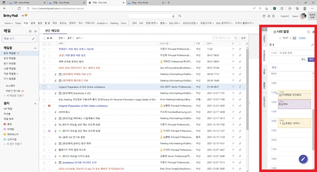 브리티 메일의 랜딩 페이지를 보면, 업무에 필요한 모든 기능이 날 기다리고 있다. 메일이나 결재 등 어떤 화면에서도 화면 우측의 엣지 패널을 통해 일정과 할 일을 손쉽게 관리할 수 있다. 핵심 업무 기능이라 할 수 있는 메일, 결재, 일정, 화상회의, 결재는 물론이고, 자주 들어가는 웹사이트도 북마크처럼 추가하여 바로 접속이 가능하다.