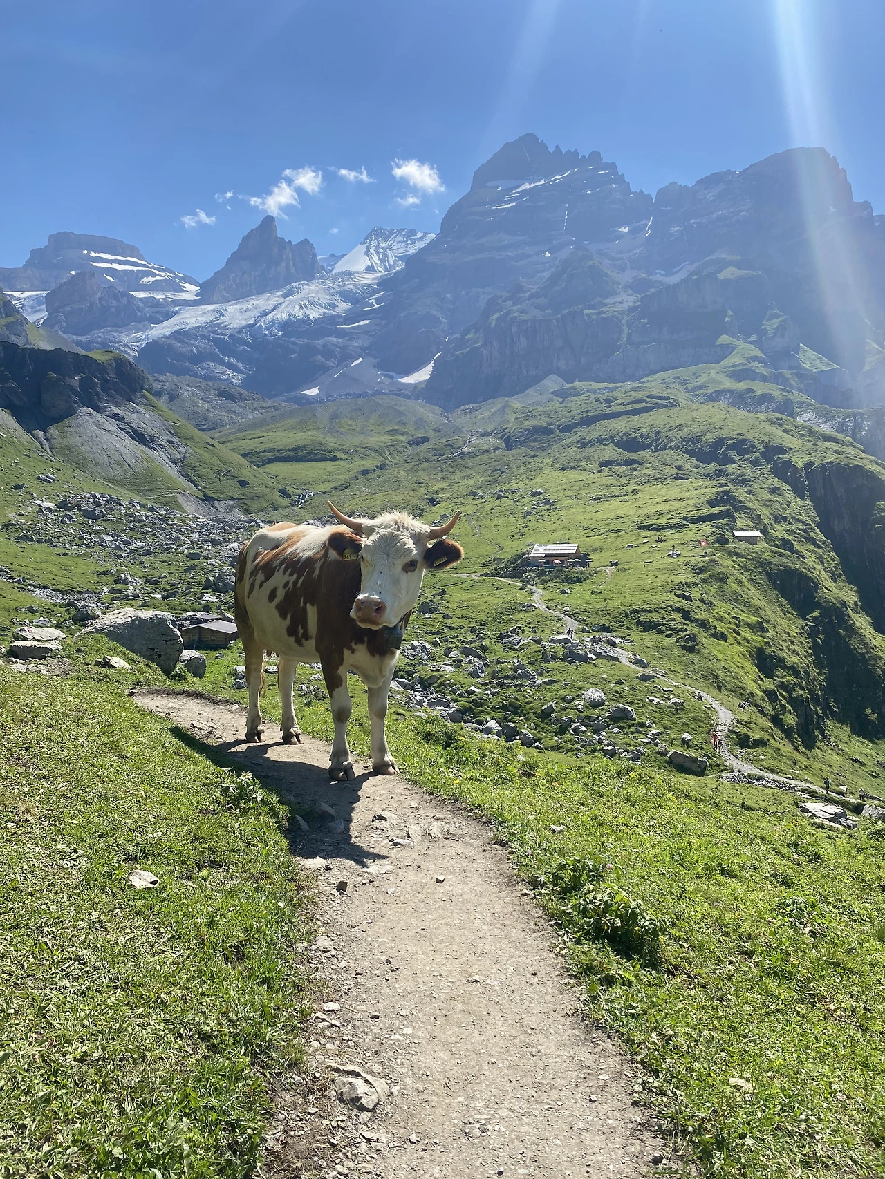 아무리 소가 초식동물이라 온순하고 인간이 오랜 시간 길들여온 가축이라 할지라도, 꽤나 크고 날카로운 뿔, 그렁그렁한 눈망울, 묵직한 체구로 내 앞길을 막고서 나를 뚫어져라 응시하는 암소 한 마리를 보고 있으면 어깨가 저절로 쪼그라든다. 우리 바로 옆에는 다른 암소가 푸짐한 엉덩이를 깔고 앉아 세차게 꼬리를 흔들며 파리를 쫓고 있었다. 그런 소들을 마냥 귀여워하며 등허리를 두어 번 쓰다듬고는 아무 일 없다는 듯이 성큼성큼 길목을 지나가는 라라 언니. 알프스 레이디의 짬바란!